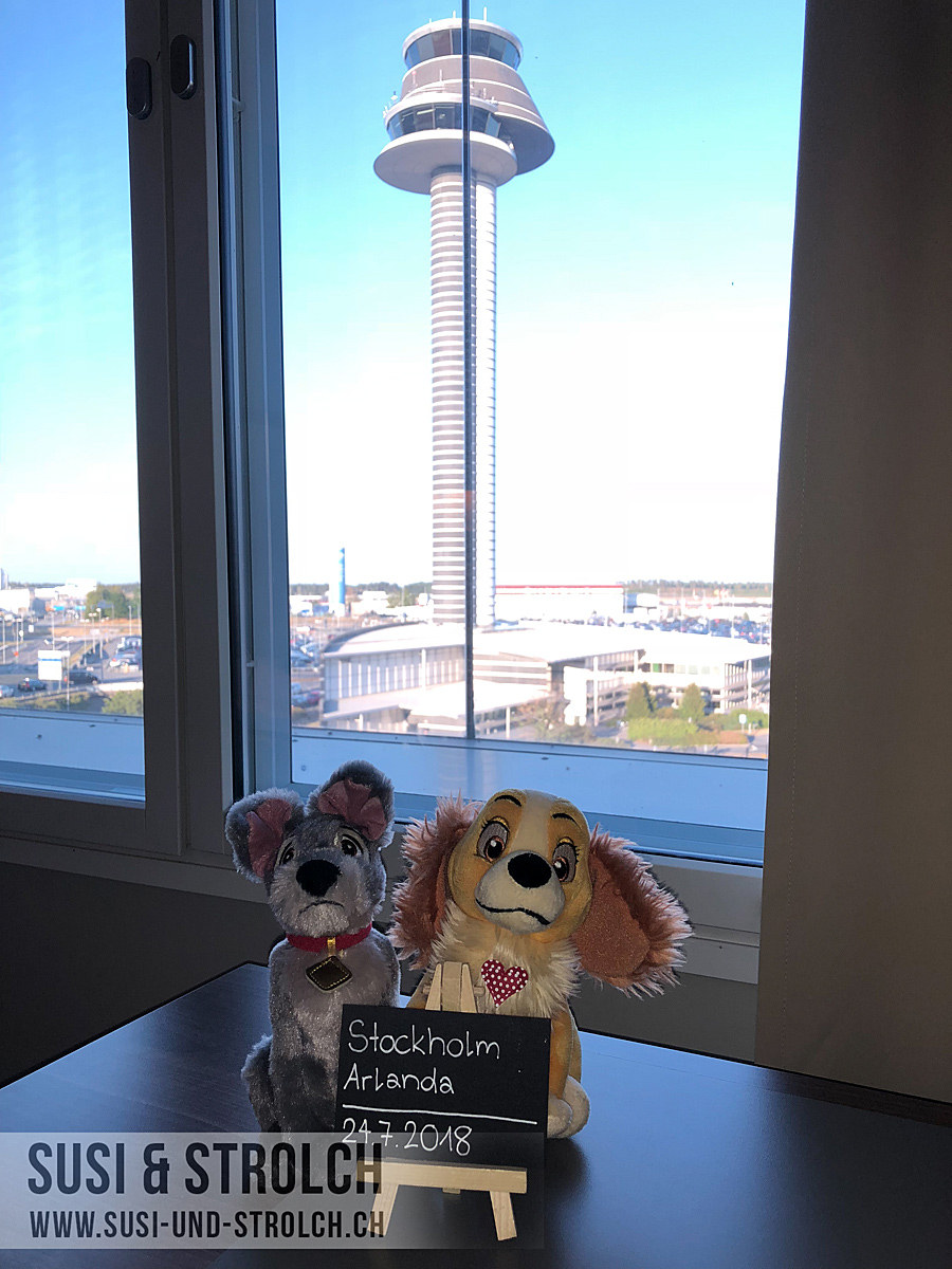 Eine besondere Reise, besser gesagt „Mini-Reise“ beginnt! Besonders in vielerlei Hinsicht. Besonders ist schon die Tatsache, dass wir mit dem eigenen Auto an den Flughafen fahren. Vorher bringe ich das hündische Trio aber noch zu meinen Eltern, auch sie dürfen natürlich Urlaub machen (am meisten darüber freuen tut sich wohl Sheltiedame Haylee :D). Danach hole ich den Strolch auf der Arbeit ab und zügig geht’s an den Flughafen. Wir sind früh genug dort. Check-In und Sicherheitskontrollen verlaufen ausnahmsweise sehr schnell, so dass wir bald am Gate A sind. Natürlich gibt es die traditionellen Luxemburgerli und schon warten wir am Gate A71 auf den Abflug. Wir fliegen wieder einmal mit der Swiss, der Airbus-321 bringt uns in gut 2 Stunden ins schwedische Stockholm, wo wir gegen 19 Uhr sicher landen.