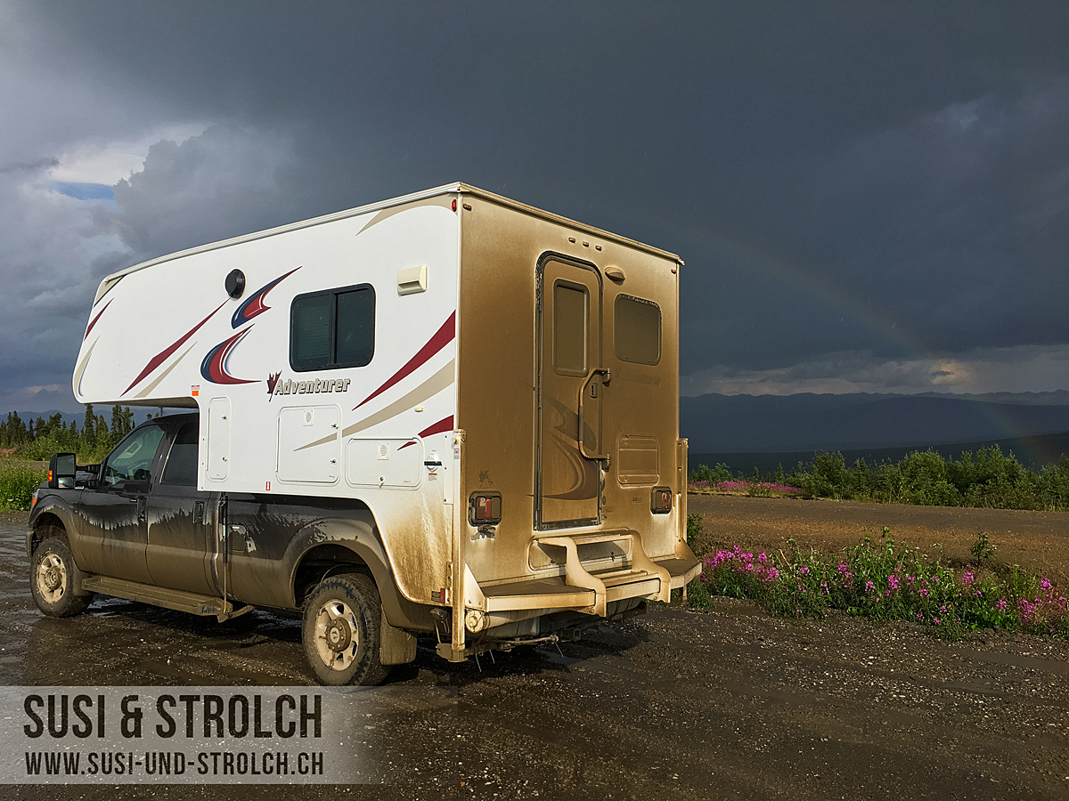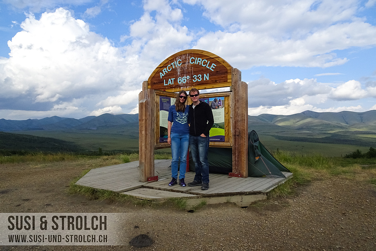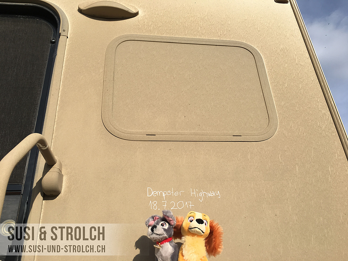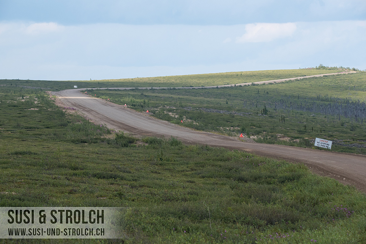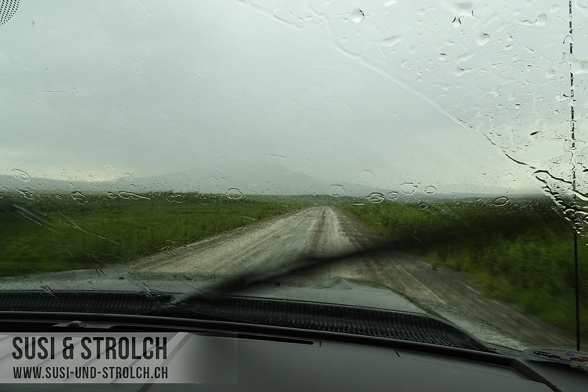 Aber zurück zum heutigen Tag. Unser Ziel heute war ganz einfach: Weiter in den Norden fahren. Ein genaues Ziel hatten wir nicht. Kaum waren wir losgefahren, sahen wir auch schon zwei Elche – leider in grosser Distanz. Das blieben dann auch unsere einzigen Tiersichtigungen für diesen Tag. Wir fuhren und fuhren und fuhren und konnten uns nicht sattsehen an der Landschaft entlang des Dempster Highways. Tundra, dichte Wälder, Gebiete mit mickrigen Nadelbäumchen, Gebirge mit steilen Felswänden… Es wechselte immer wieder und sorgte für so manchen WOW-Effekt. Die Strasse war entgegen aller Erwartungen einwandfrei zu befahren. Klar, es gibt Schlaglöcher und steinige Etappen, aber alles in allem wirklich seeeehr angenehm und auch zügig zu befahren. Nach gut 300km (ohne Haus, ohne Zivilisationsanzeichen – nur pure Natur!) erreichten wir Eagle Plains. „Ortschaft“ wäre eigentlich übertrieben… Es gibt ein Hotel, ein Restaurant, einen Campingplatz und… sehr wichtig! Eine Tankstelle 🙂 Nach 370km ist man doch froh, kann man sein Gefährt wieder mit Benzin füllen, wobei es problemlos reichte. Spontan entschieden wir uns im Restaurant zwei Chicken Burger zu bestellen, nachmittags um 16 Uhr ist doch die perfekte Zeit dazu 😉 Wieder halbwegs lebendig stiegen wir erneut in den „Eliot“ und fuhren noch die restlichen knapp 40km bis zum Arctic Circle. An diesem Punkt verschwindet die Sonne am 21. Juni für 6 Wochen nie mehr unter dem Horizont, d.h. es ist 24 Stunden Tag. Am 21. Dezember kehrt es dann… Dann hat man 24 Stunden tiefste Nacht und dunkel! Kaum sind wir am Arctic Circle angelangt, beginnt es erstmals in diesen Ferien so richtig, richtig zu regnen. Nein, es schüttet! Und dazu noch Donner und Blitz. Also schnell auf den Rückweg nach Eagle Plains. Die Fahrt wird dann ziemlich abenteuerlich, die Strasse verwandelt sich in die reinste Schlammparty und es gibt immer wieder diese ungeheuerlichen Momente, wo ich das Fahrzeug nicht mehr unter Kontrolle hatte und es einfach vor sich hin rutschte. Nicht toll! Und einige Momente lang dachte ich wirklich, wir landen nun gleich neben der Strasse und müssen sterben. Oder so ähnlich! Zum Glück konnten wir den 4-Rad-Antrieb einschalten und so ging es dann irgendwie. Langsam und mit einigen Adrenalinschüben, ist so ein Truckcamper doch nicht gerade ein kleines, wendiges Autöchen, sondern ein Riesending mit Riesengewicht!