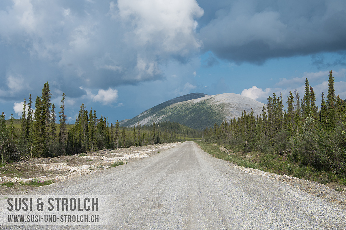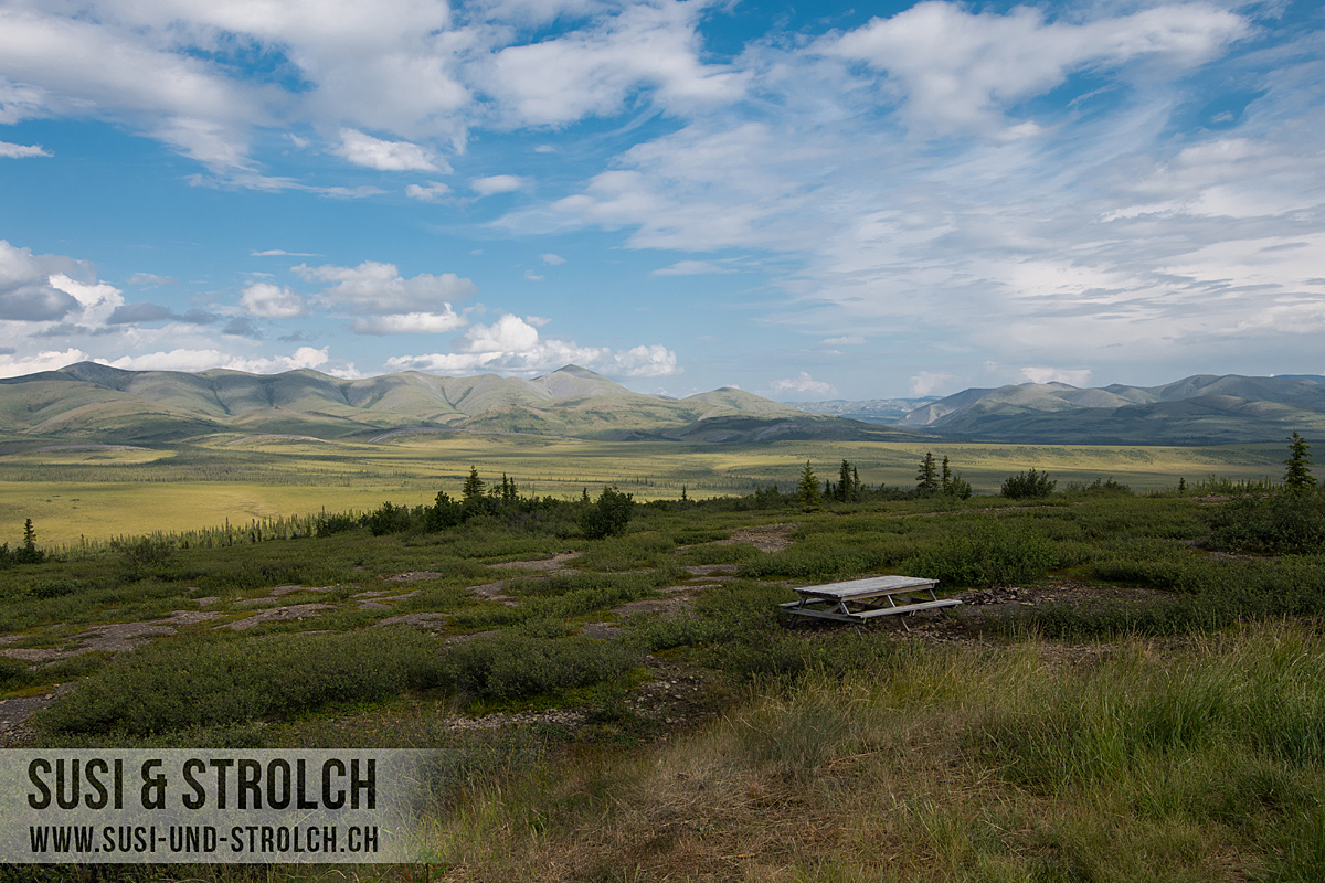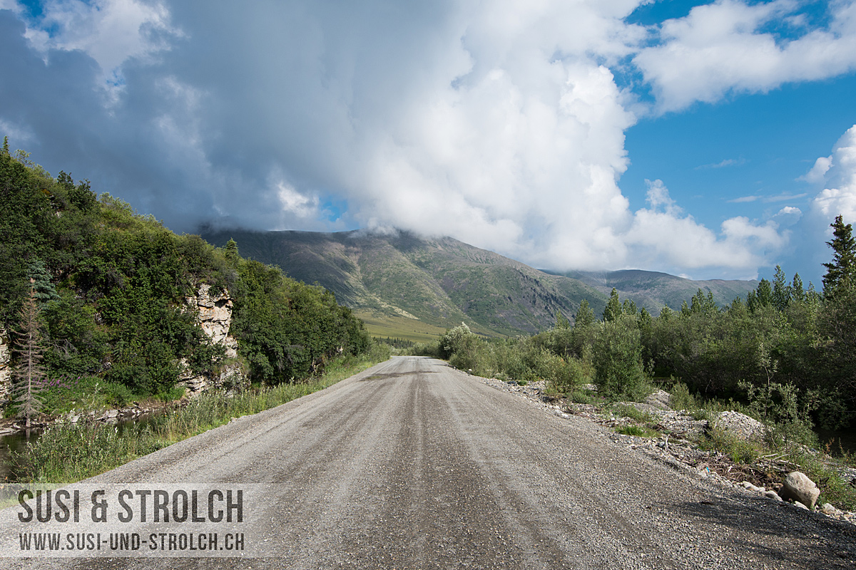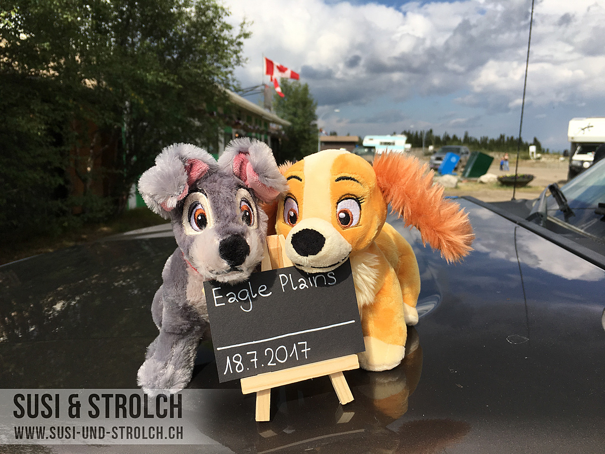 Aber zurück zum heutigen Tag. Unser Ziel heute war ganz einfach: Weiter in den Norden fahren. Ein genaues Ziel hatten wir nicht. Kaum waren wir losgefahren, sahen wir auch schon zwei Elche – leider in grosser Distanz. Das blieben dann auch unsere einzigen Tiersichtigungen für diesen Tag. Wir fuhren und fuhren und fuhren und konnten uns nicht sattsehen an der Landschaft entlang des Dempster Highways. Tundra, dichte Wälder, Gebiete mit mickrigen Nadelbäumchen, Gebirge mit steilen Felswänden… Es wechselte immer wieder und sorgte für so manchen WOW-Effekt. Die Strasse war entgegen aller Erwartungen einwandfrei zu befahren. Klar, es gibt Schlaglöcher und steinige Etappen, aber alles in allem wirklich seeeehr angenehm und auch zügig zu befahren. Nach gut 300km (ohne Haus, ohne Zivilisationsanzeichen – nur pure Natur!) erreichten wir Eagle Plains. „Ortschaft“ wäre eigentlich übertrieben… Es gibt ein Hotel, ein Restaurant, einen Campingplatz und… sehr wichtig! Eine Tankstelle 🙂 Nach 370km ist man doch froh, kann man sein Gefährt wieder mit Benzin füllen, wobei es problemlos reichte. Spontan entschieden wir uns im Restaurant zwei Chicken Burger zu bestellen, nachmittags um 16 Uhr ist doch die perfekte Zeit dazu 😉 Wieder halbwegs lebendig stiegen wir erneut in den „Eliot“ und fuhren noch die restlichen knapp 40km bis zum Arctic Circle. An diesem Punkt verschwindet die Sonne am 21. Juni für 6 Wochen nie mehr unter dem Horizont, d.h. es ist 24 Stunden Tag. Am 21. Dezember kehrt es dann… Dann hat man 24 Stunden tiefste Nacht und dunkel! Kaum sind wir am Arctic Circle angelangt, beginnt es erstmals in diesen Ferien so richtig, richtig zu regnen. Nein, es schüttet! Und dazu noch Donner und Blitz. Also schnell auf den Rückweg nach Eagle Plains. Die Fahrt wird dann ziemlich abenteuerlich, die Strasse verwandelt sich in die reinste Schlammparty und es gibt immer wieder diese ungeheuerlichen Momente, wo ich das Fahrzeug nicht mehr unter Kontrolle hatte und es einfach vor sich hin rutschte. Nicht toll! Und einige Momente lang dachte ich wirklich, wir landen nun gleich neben der Strasse und müssen sterben. Oder so ähnlich! Zum Glück konnten wir den 4-Rad-Antrieb einschalten und so ging es dann irgendwie. Langsam und mit einigen Adrenalinschüben, ist so ein Truckcamper doch nicht gerade ein kleines, wendiges Autöchen, sondern ein Riesending mit Riesengewicht!