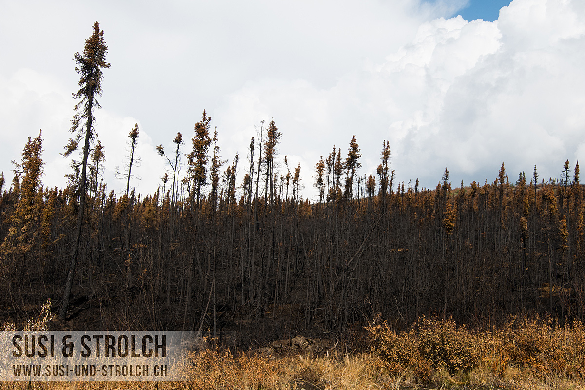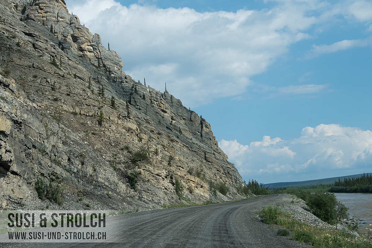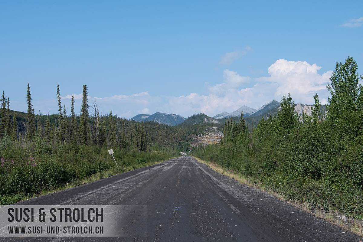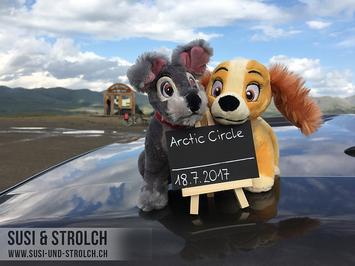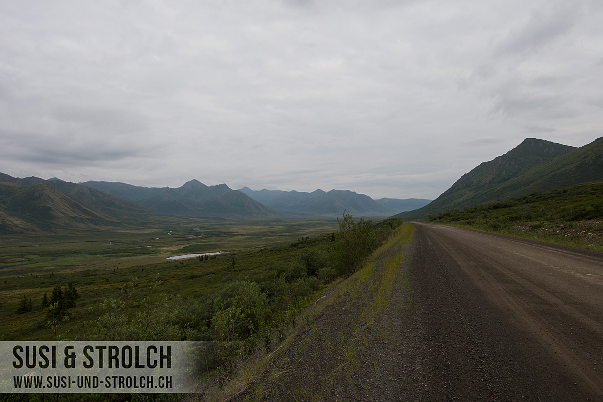 Aber zurück zum heutigen Tag. Unser Ziel heute war ganz einfach: Weiter in den Norden fahren. Ein genaues Ziel hatten wir nicht. Kaum waren wir losgefahren, sahen wir auch schon zwei Elche – leider in grosser Distanz. Das blieben dann auch unsere einzigen Tiersichtigungen für diesen Tag. Wir fuhren und fuhren und fuhren und konnten uns nicht sattsehen an der Landschaft entlang des Dempster Highways. Tundra, dichte Wälder, Gebiete mit mickrigen Nadelbäumchen, Gebirge mit steilen Felswänden… Es wechselte immer wieder und sorgte für so manchen WOW-Effekt. Die Strasse war entgegen aller Erwartungen einwandfrei zu befahren. Klar, es gibt Schlaglöcher und steinige Etappen, aber alles in allem wirklich seeeehr angenehm und auch zügig zu befahren. Nach gut 300km (ohne Haus, ohne Zivilisationsanzeichen – nur pure Natur!) erreichten wir Eagle Plains. „Ortschaft“ wäre eigentlich übertrieben… Es gibt ein Hotel, ein Restaurant, einen Campingplatz und… sehr wichtig! Eine Tankstelle 🙂 Nach 370km ist man doch froh, kann man sein Gefährt wieder mit Benzin füllen, wobei es problemlos reichte. Spontan entschieden wir uns im Restaurant zwei Chicken Burger zu bestellen, nachmittags um 16 Uhr ist doch die perfekte Zeit dazu 😉 Wieder halbwegs lebendig stiegen wir erneut in den „Eliot“ und fuhren noch die restlichen knapp 40km bis zum Arctic Circle. An diesem Punkt verschwindet die Sonne am 21. Juni für 6 Wochen nie mehr unter dem Horizont, d.h. es ist 24 Stunden Tag. Am 21. Dezember kehrt es dann… Dann hat man 24 Stunden tiefste Nacht und dunkel! Kaum sind wir am Arctic Circle angelangt, beginnt es erstmals in diesen Ferien so richtig, richtig zu regnen. Nein, es schüttet! Und dazu noch Donner und Blitz. Also schnell auf den Rückweg nach Eagle Plains. Die Fahrt wird dann ziemlich abenteuerlich, die Strasse verwandelt sich in die reinste Schlammparty und es gibt immer wieder diese ungeheuerlichen Momente, wo ich das Fahrzeug nicht mehr unter Kontrolle hatte und es einfach vor sich hin rutschte. Nicht toll! Und einige Momente lang dachte ich wirklich, wir landen nun gleich neben der Strasse und müssen sterben. Oder so ähnlich! Zum Glück konnten wir den 4-Rad-Antrieb einschalten und so ging es dann irgendwie. Langsam und mit einigen Adrenalinschüben, ist so ein Truckcamper doch nicht gerade ein kleines, wendiges Autöchen, sondern ein Riesending mit Riesengewicht!