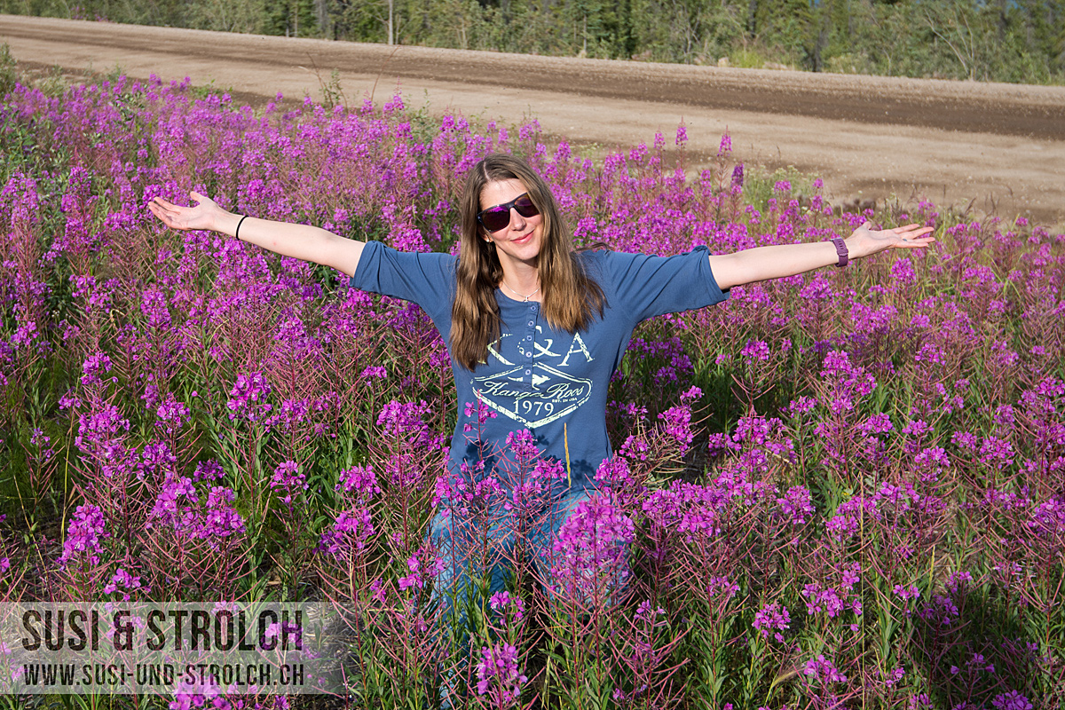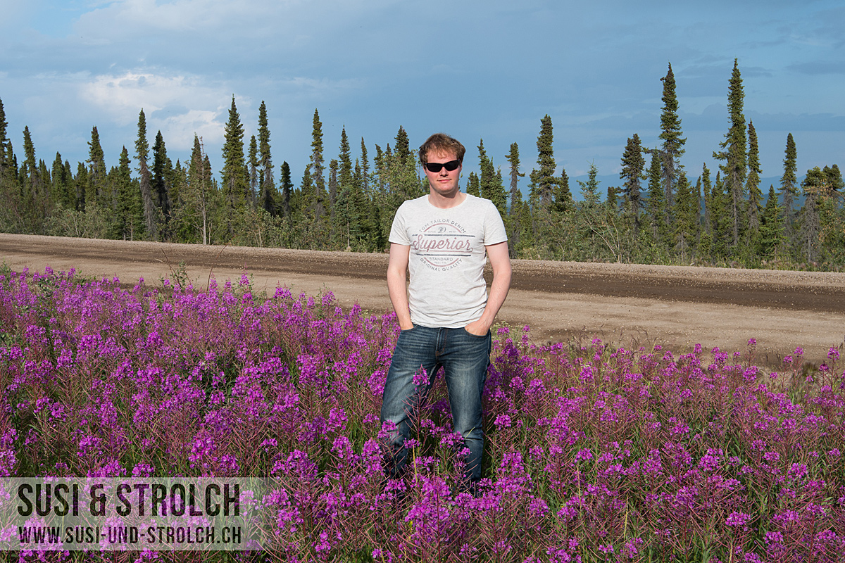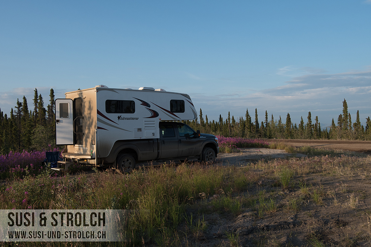 Zurück in Eagle Plains kam dann bereits wieder die Sonne und unsere gute Laune mit der eingetroffenen Erleichterung zurück. In Eagle Plains selber gefiel es uns nicht, so fuhren wir noch rund 20km weiter zurück in den Süden und stellten den Eliot an ein wunderschönes Plätzchen ab. Inzwischen war wieder strahlender Sonnenschein und inmitten des Fireweeds (das sind diese typisch alaska-yukon-ischen Blümchen in violett-pink) fühlte ich mich so wie im Paradies. Es wurde ein bisschen Drohne geflogen, etwas kurzes gekocht und einfach die Stimmung genossen.