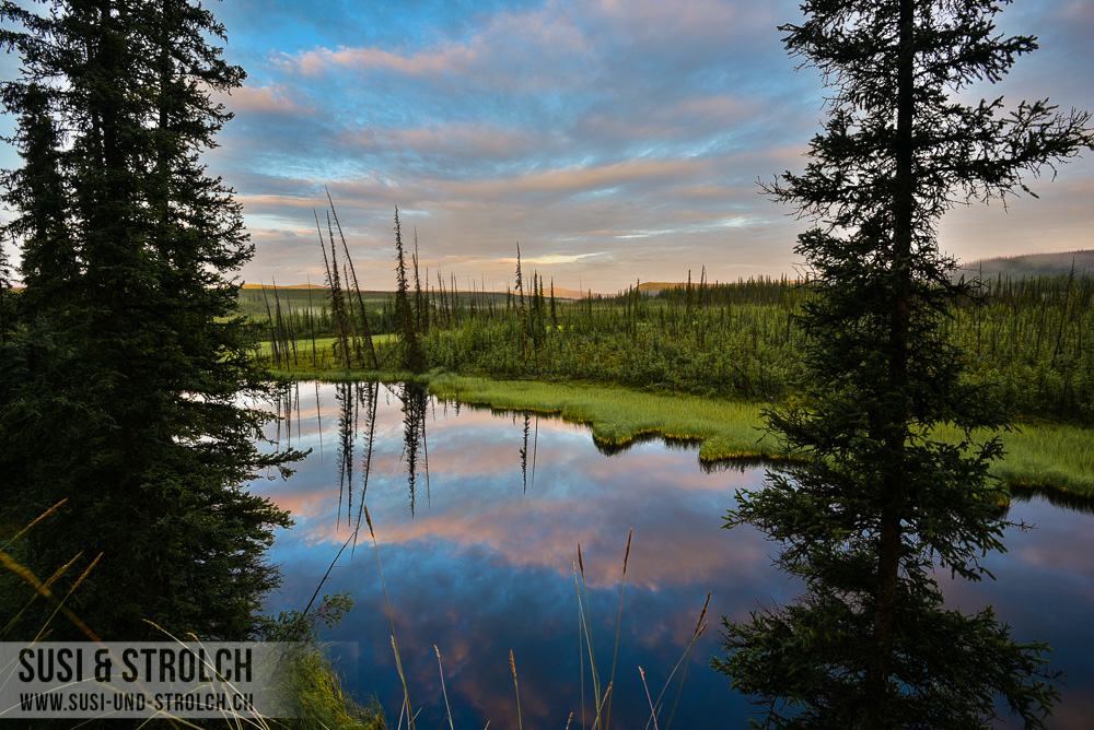 An dieser Stelle müssen wir noch erwähnen, dass wir auf der ganzen Strecke des „Top of the World“ absolut kein einziges Tier sichten konnten – was ja schon sehr unwahrscheinlich ist 🙁 Immerhin entdeckten wir bei der Fahrt weiter von Dawson noch einen Tümpel mit mehreren Bibern drin! Yeah, ich wollte doch schon immer mal Biber sehen =)