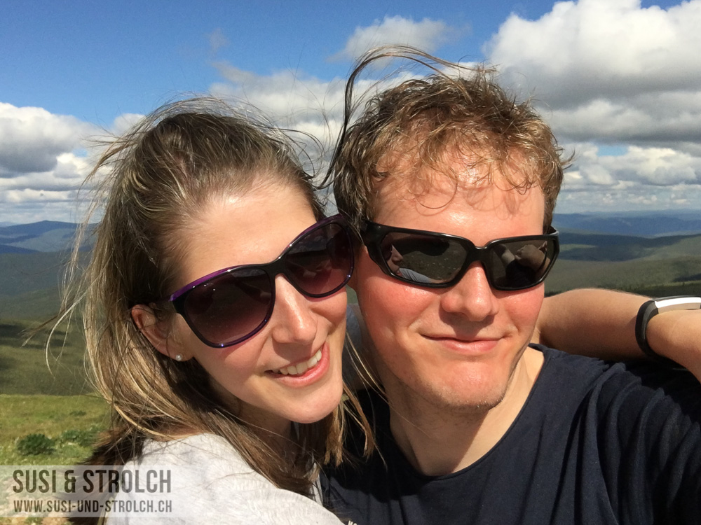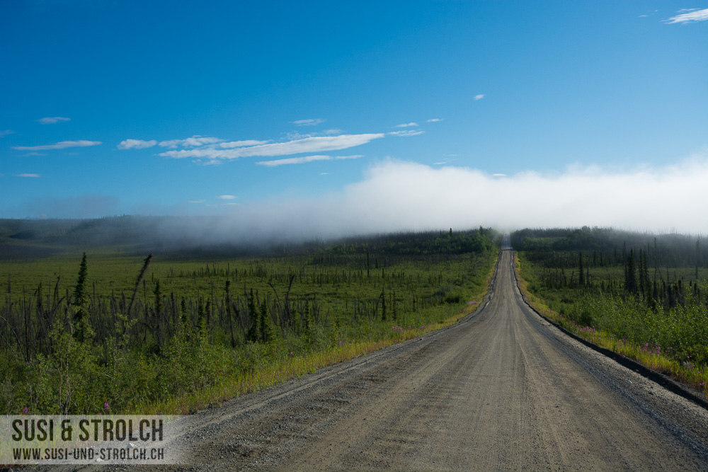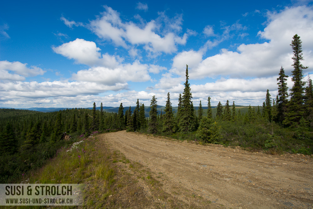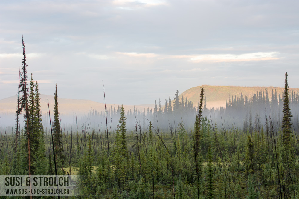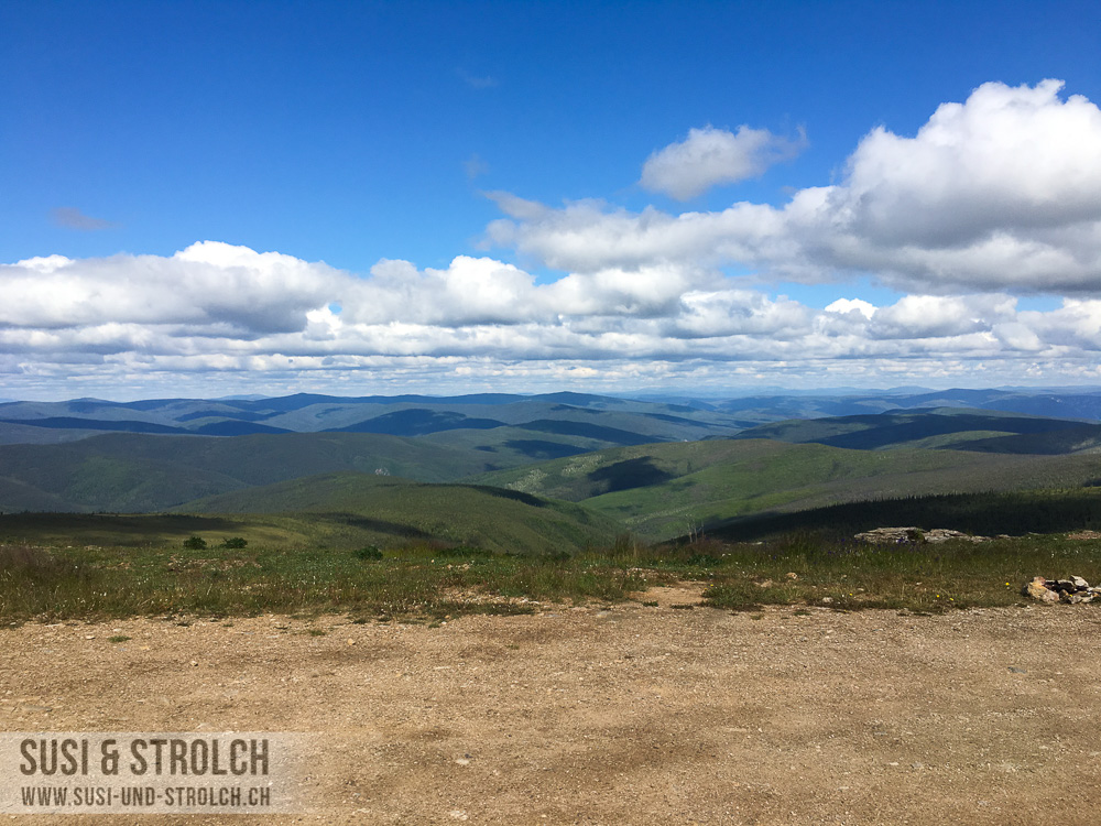 Und dann ging es los! Der „Top of the World“-Highway ist eine wunderschöne, kurvige Strasse, die von Alaska nach Kanada führt. Ein grosser Teil der Strasse ist Naturstrasse und dementsprechend ist das Befahren der Strasse sehr vom Wetter abhängig. Wie gesagt – wir hatten Glück und es war eine wunderschöne Erfahrung, diese Strasse befahren zu können. Die Landschaft war beeindruckend und nach jeder Kurve entlockten uns die neuen Aussichten noch mehr „Woooooow!“ und „Oooooooh“ und „Booaaaaah“. Fotografisch festhalten kann man diese ungezähmte Schönheit und diese Weite leider kaum – und Möglichkeiten zum Anhalten gab es auch kaum. So gibt’s von heute leider nur einige Schnappschüsse zum Fenster raus.