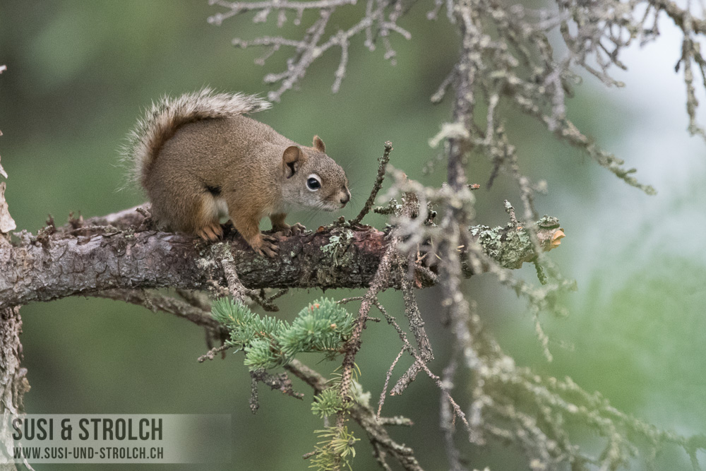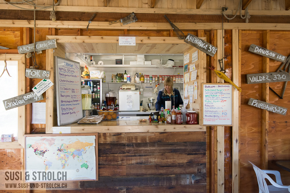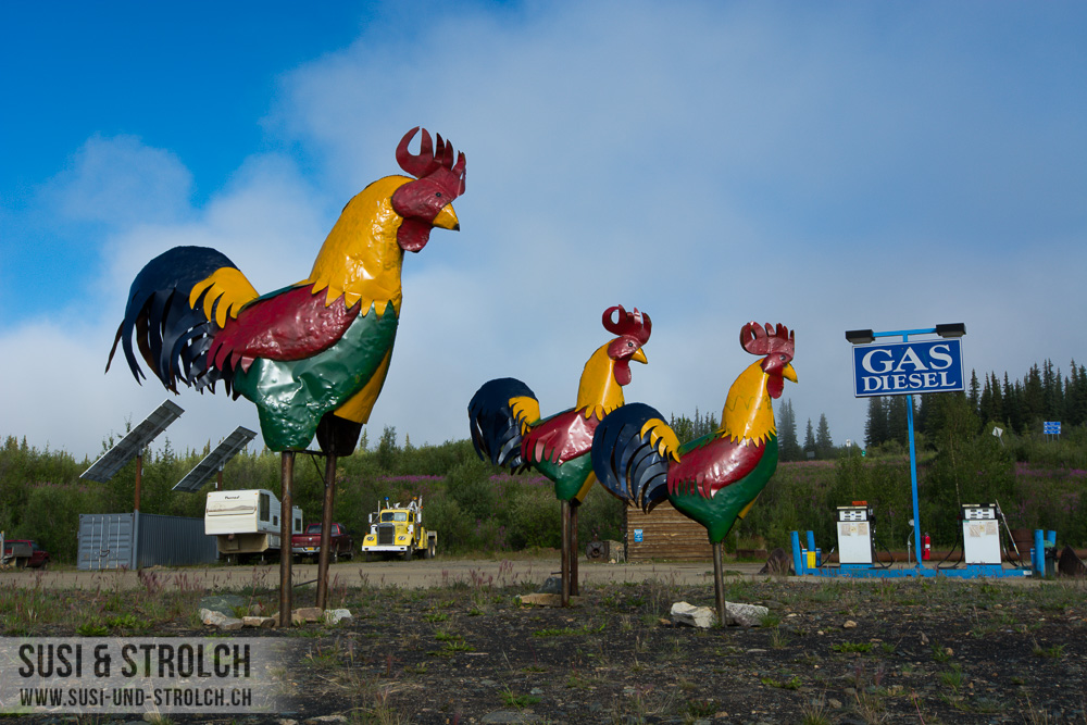 Um 20 vor 4 in aller Herrgottsfrühe war ich hellwach und konnte partout nicht mehr einschlafen. So packte ich die Kameraausrüstung und ging rund um den Campground auf Pirsch. Leider nicht sehr erfolgreich. An dem „elch-paradiesischen“ Tümpel liess sich kein einziger Elch blicken und auch sonst entdeckte ich so ziemlich gar nichts, ausser einigen Vögelchen und Eichhörnchen. Naja. Schön war’s trotzdem, in dieser tollen Lichtstimmung (es ist natürlich bereits hell um diese Uhrzeit!) und in dieser völligen Stille! 🙂 Als Dominique auch wach wurde, gab es ein kurzes Frühstück und wir fuhren bereits um 07:30 Uhr los. Die Gegend rund um den Campground war in dicken Nebel gehüllt und nach wie vor waren wir unsicher, ob wir den „Top of the World“-Highway wirklich fahren können. Nach kurzer Fahrt kam aber die Sonne und den ganzen Tag über begleitete uns ein wahrlich perfektes Traumwetterchen – was haben wir für ein Glück! Wir haben also eins gelernt: Die alaskanischen Wetterprognosen kannst du gleich eimern 😉 In der witzigen, ehemaligen Goldgräberstadt Chicken haben wir „Grimm“ aufgetankt und uns ein leckeres Frühstück gegönnt. Das Städtchen ist jenseits jeglicher Zivilsation und hat einen ganz besonderen Charme! Im Sommer leben hier gegen die 50 Personen, im Winter sind es keine 10. Es gibt weder Strom noch Handyempfang noch Internetleitung – aber die Bewohner wissen sich zu helfen mit Generatoren, Satelliten-Empfang etc.