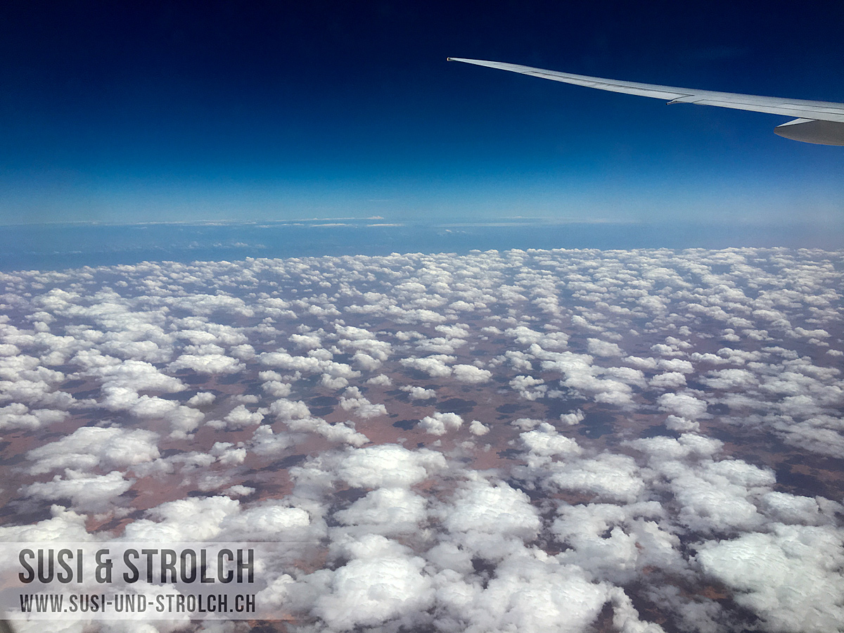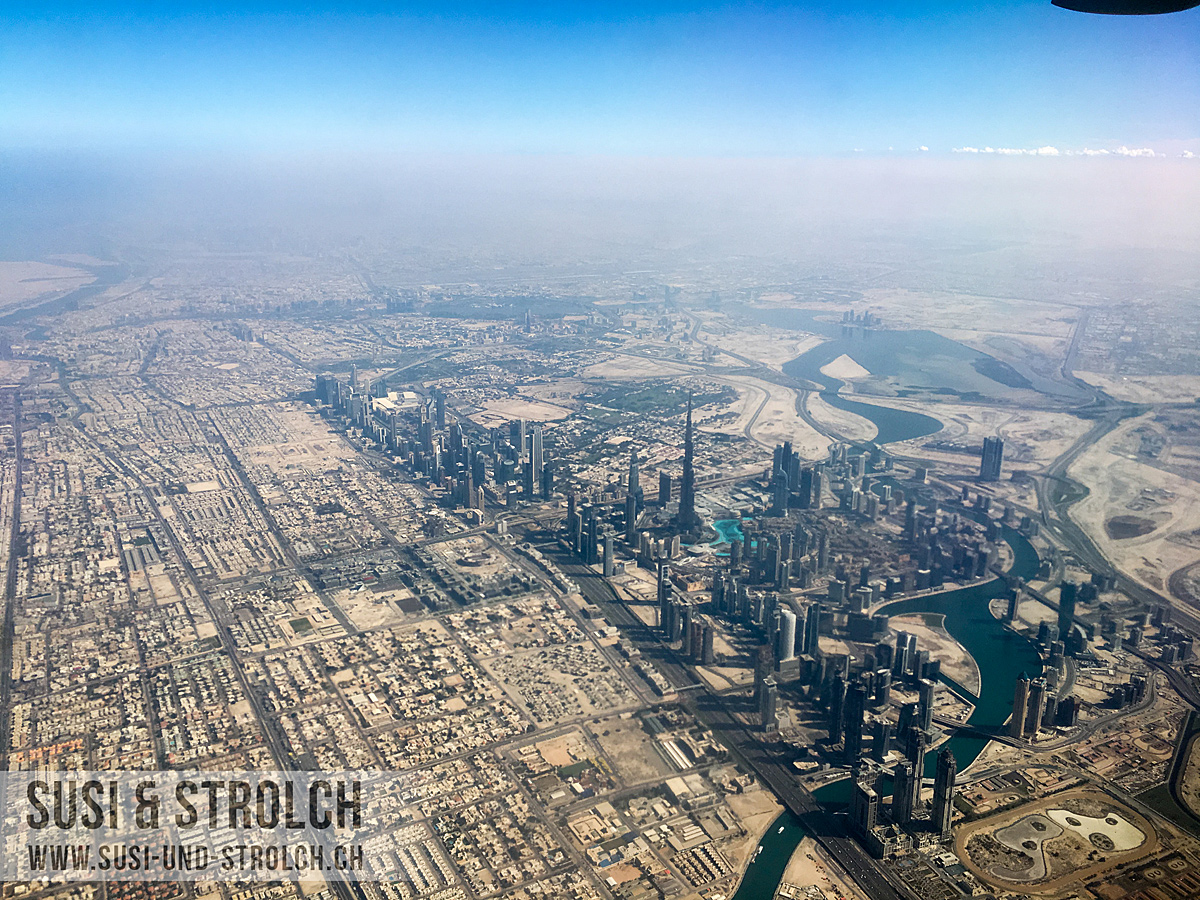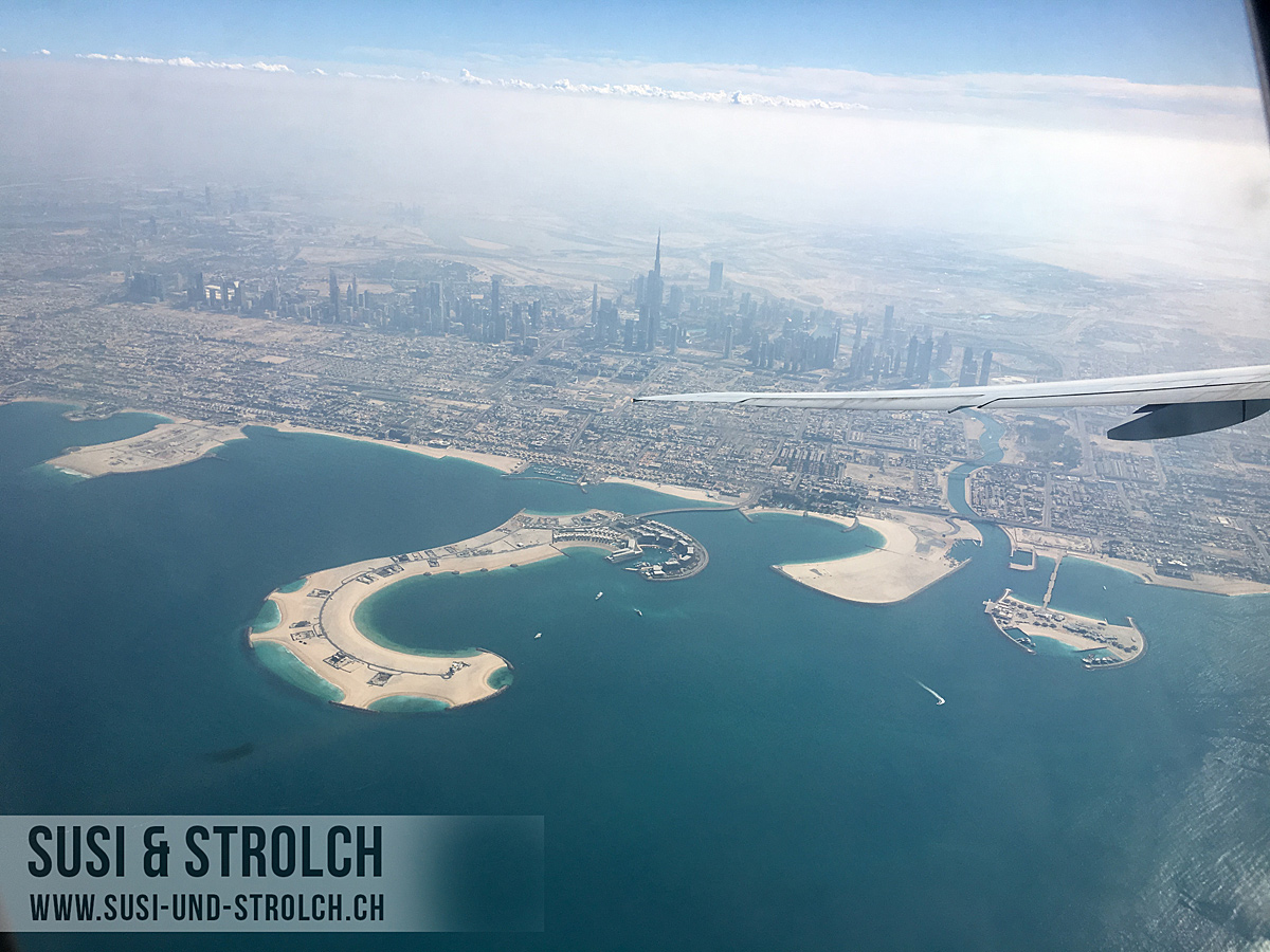 Nachdem unsere letzten Reisen immer in aller Herrgottsfrühe begonnen hatten, begann die aktuelle Reise spät. Nachdem wir beide noch arbeiten mussten, gab es nach Feierabend noch einen stressigen Endspurt beim Packen. Um 17 Uhr kam unser Privat-Chauffeur Johnny, lud uns und unser Gepäck in seine Limousine und brachte uns sicher und zügig an den Flughafen in Zürich. Unterwegs hatte es erstaunlich wenig Stau und am Flughafen erstaunlich wenig Wartezeit, sodass wir sogar viel zu früh dort waren. Das ermöglichte uns noch ein gemeinsames Abendessen im „Upperdeck“ 🙂 Danach ruckzuck durch die Sicherheitskontrolle und ab ins Flugzeug. Eine A380 der Emirates Airlines brachte uns nach Dubai – ein langjähriger Traum geht damit für mich in Erfüllung! Das grösste Passagierflugzeug der Welt hat mich schon lange fasziniert und heute durfte ich endlich damit fliegen. Ein echt cooles, riesiges Ding! Von den Emirates waren wir restlos begeistert, soooooo viel Platz in der „billigen Holzklasse“, wirklich unglaublich. Service, Essen, Ausstattung, Entertainment System… Alles top! So konnten wir beide den Nachtflug grösstenteils verpennen…