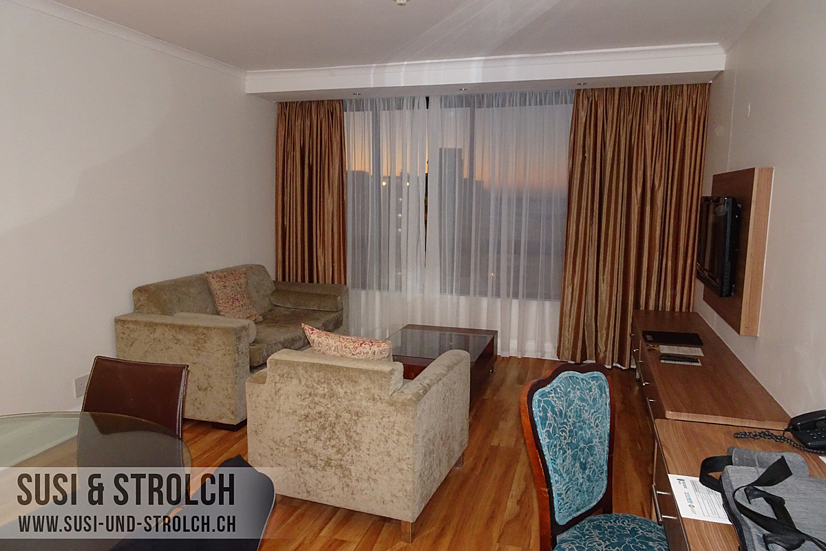 Unser Hotelzimmer war eigentlich eher ein kleines Appartement, sehr cool und dank einem fetten Booking.com-Rabatt war es sogar erschwinglich. Direkter Blick aufs Meer, separate Sitzecke und sogar eine kleine Küchenzeile. Wir waren aber so müde, dass wir nur noch ein kleines Abendessen aufs Zimmer bestellten und uns dann ins Bett schmissen.