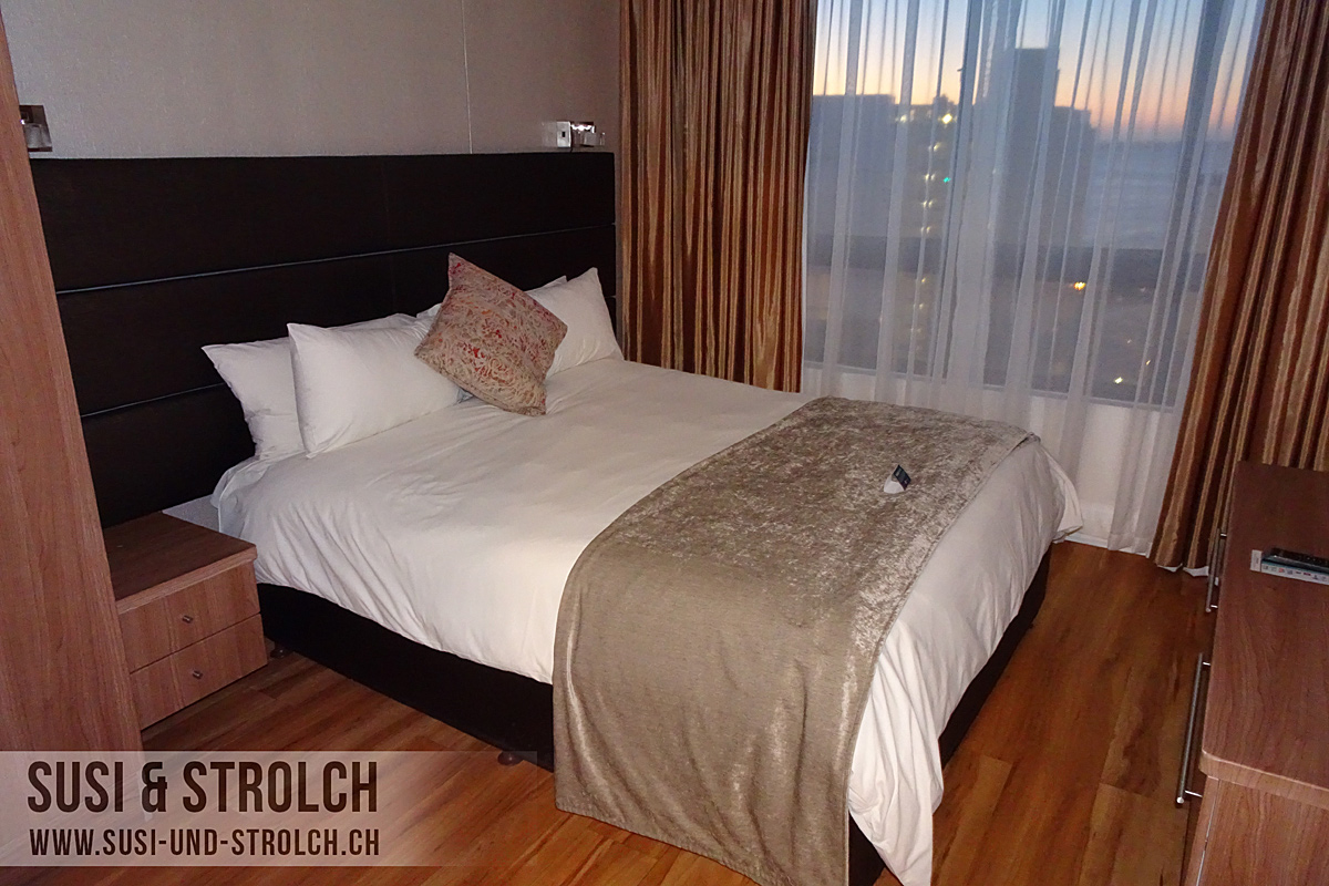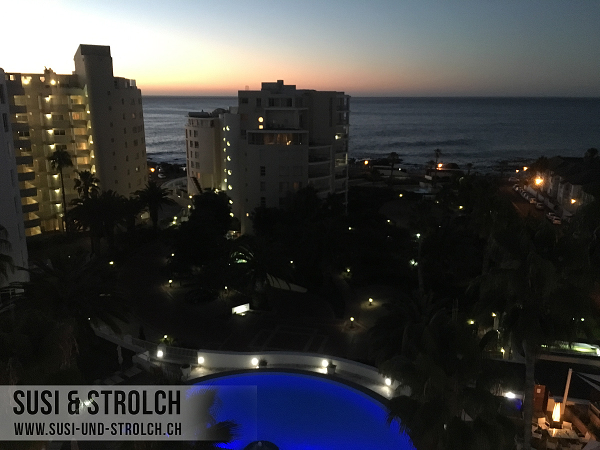 Die Passkontrolle dauerte eine gefühlte Ewigkeit. Endlich durch, nahmen wir unsere Koffer in Empfang und suchten in der Ankunftshalle unseren Fahrer vom Hotel. Keiner da. Diverse „offizielle Taxi-Vermittler“ kamen aber auf uns zugestürmt und jeder wollte uns ein Taxi vermitteln und zeigte uns irgendwelche Ausweise. Uns war sofort klar, dass hier etwas faul ist und das keinesfalls offizielle Taxi-Vermittler sind. So lehnten wir dankend ab – aufdringlich war übrigens kein einziger. Weiter vorne beim Flughafen fanden wir dann die wirklich offiziellen Taxi-Vermittler und eine Frau fuhr uns in einer guten halben Stunde zum Hotel. Die Frau war echt super! Unterwegs erzählte sie uns sooo viel über Kapstadt und das ganze Land, richtig toll.