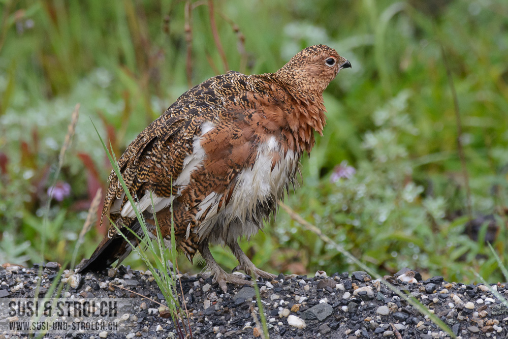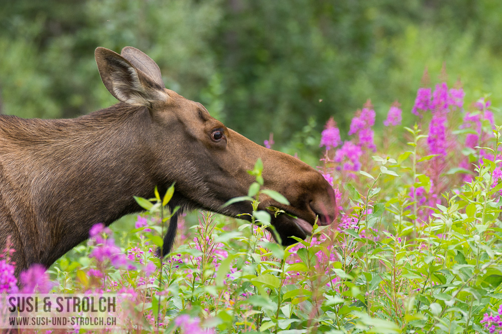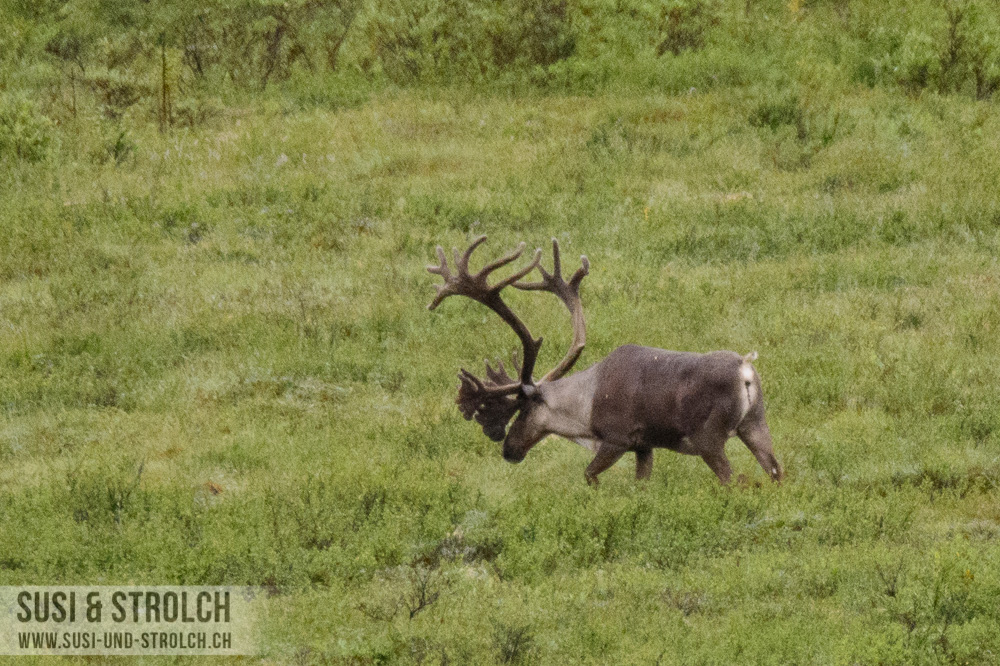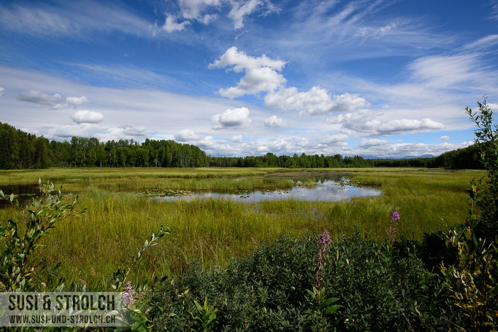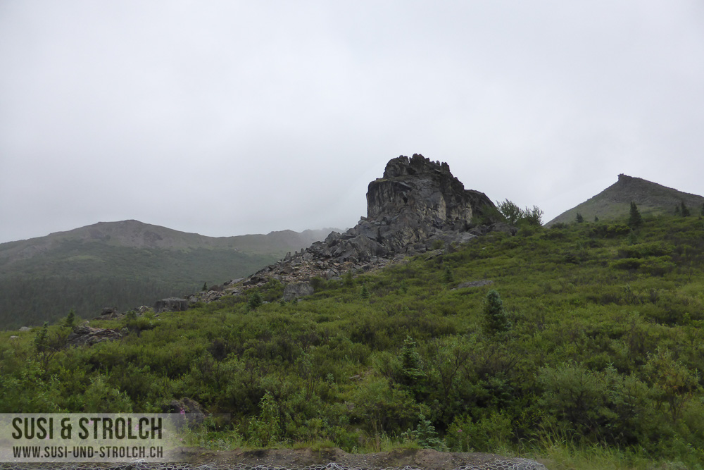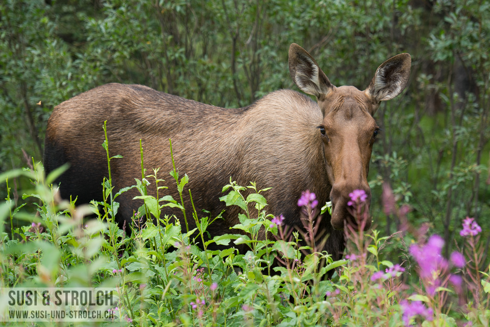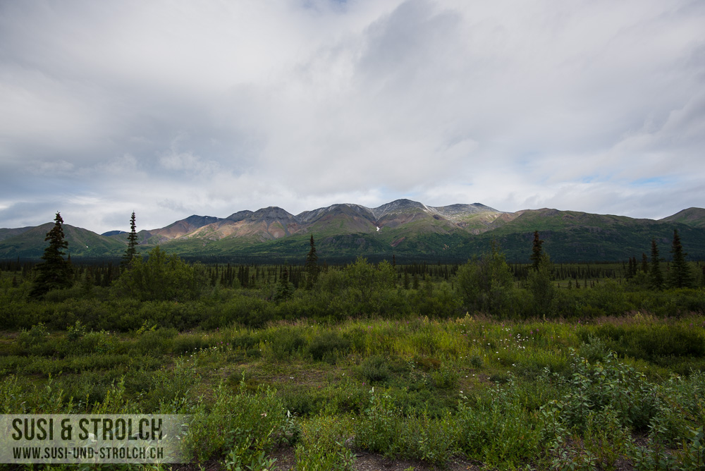 Abschied nehmen vom Denali Nationalpark! Obwohl das Wetter erneut sch… war, kämpften wir uns sehr früh aus dem Bett und waren bereits kurz nach 6 Uhr unterwegs Richtung Parkausgang. Unser Ziel: Zahlreiche Wildtiere sehen bei der Rückfahrt. Der Plan ging leider nicht auf… Aber immerhin durften wir zahlreiche Regentröpfchen und Regenwölkchen und Nebelbänklein beobachten 😛 Kurz vor dem Ausgang dann endlich, endlich DIE Wildlifebegegnung: Eine Elchdame direkt am Strassenrand! Und die gute Dame (wir tauften sie „Esmeralda“) verkörperte eines meiner absoluten Wunschsujets dieser Reise: Ein Elch inmitten von Fireweed. Wir durften die (Un-)Hübsche recht lange beobachten, wie sie unbeirrt Gräslein zupfte. Zufrieden fuhren wir weiter und auf dem Park Highway ging es zügig weiter gegen Süden.