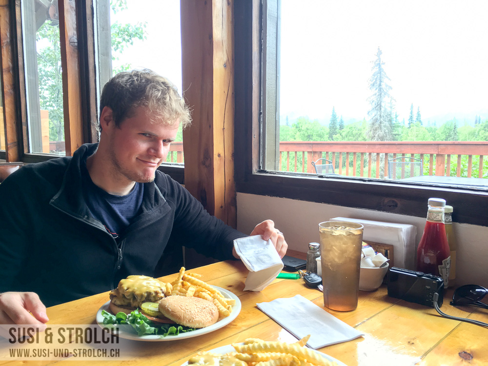 Auf der Durchfahrt entdeckten wir einen RV Park, wo wir gegen eine kleine Gebühr die Duschen wie auch Dumpstation nutzen durften. Mittagessen nahmen wir in einer herzigen „McKinley View“-Lodge zu uns. Wetterbedingt natürlich ohne McKinley-Sicht.
