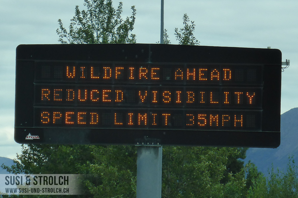 Das Fahren war so angenehm, das Wetter war so unangenehm… Lange Rede kurzer Sinn: Wir fuhren einfach und fuhren und fuhren… Und die Meilen auf dem Tacho wurden mehr und mehr… Und plötzlich befanden wir uns bereits südlich von Anchorage. Dem Turnagain Arm entlang schlugen wir unseren Weg Richtung Kenai Halbinsel ein. Dort wurden wir von Waldbränden empfangen. Wir guckten uns erst einen Campground direkt am Turnagain Arm an (Bird Creek Campground), dort roch man den Rauch vom Waldbrand aber so sehr, dass wir noch weiterfuhren und schlussendlich den „Bertha Creek Campground“ für perfekt empfanden.