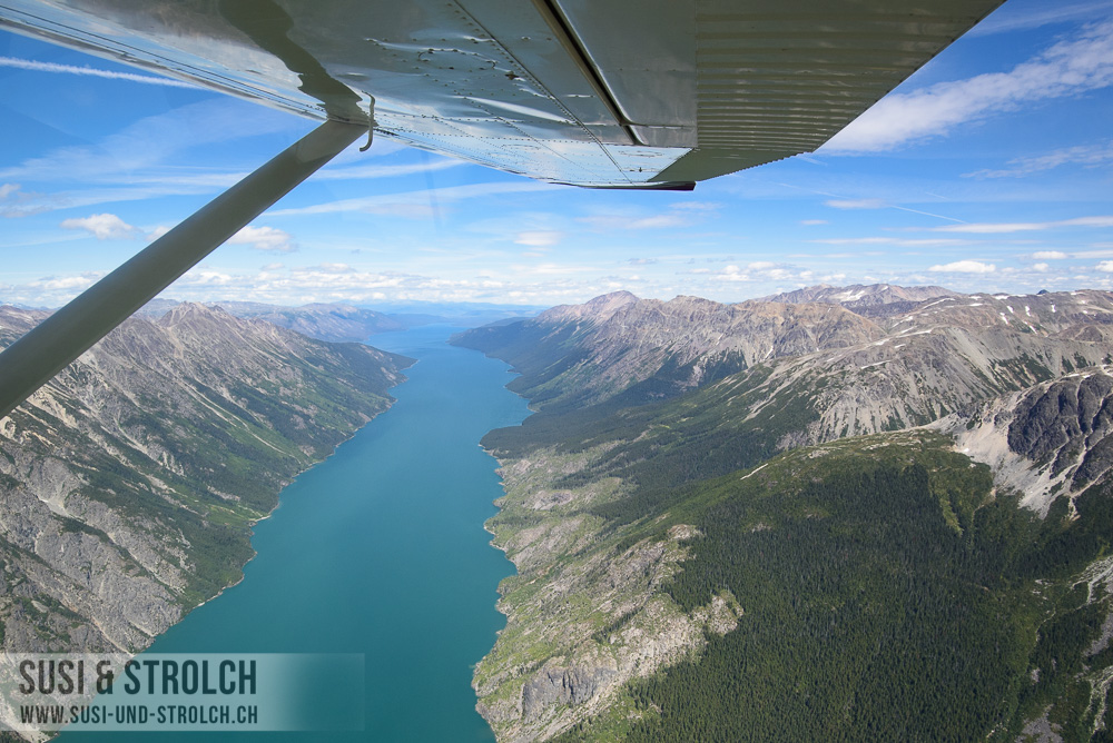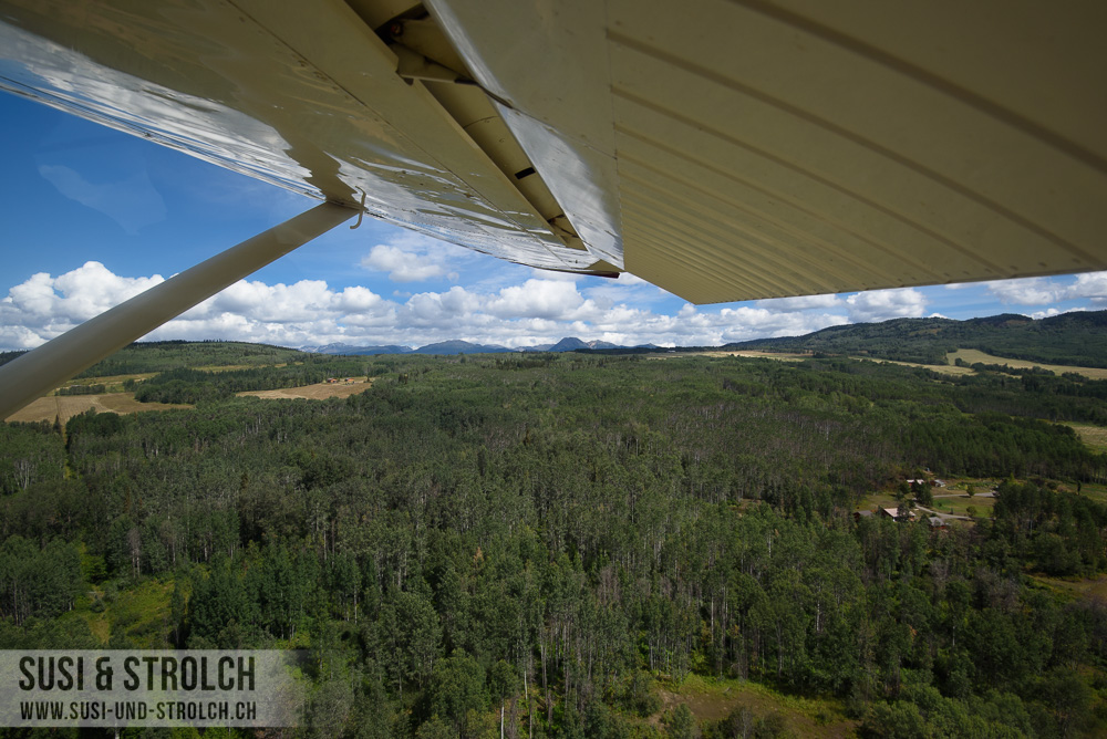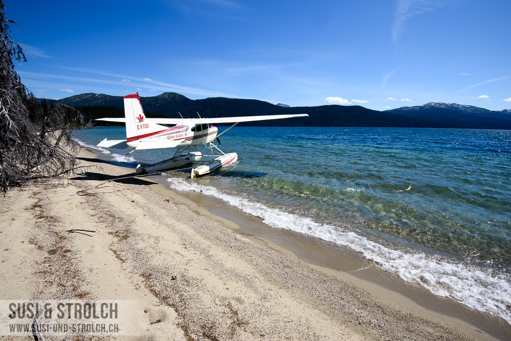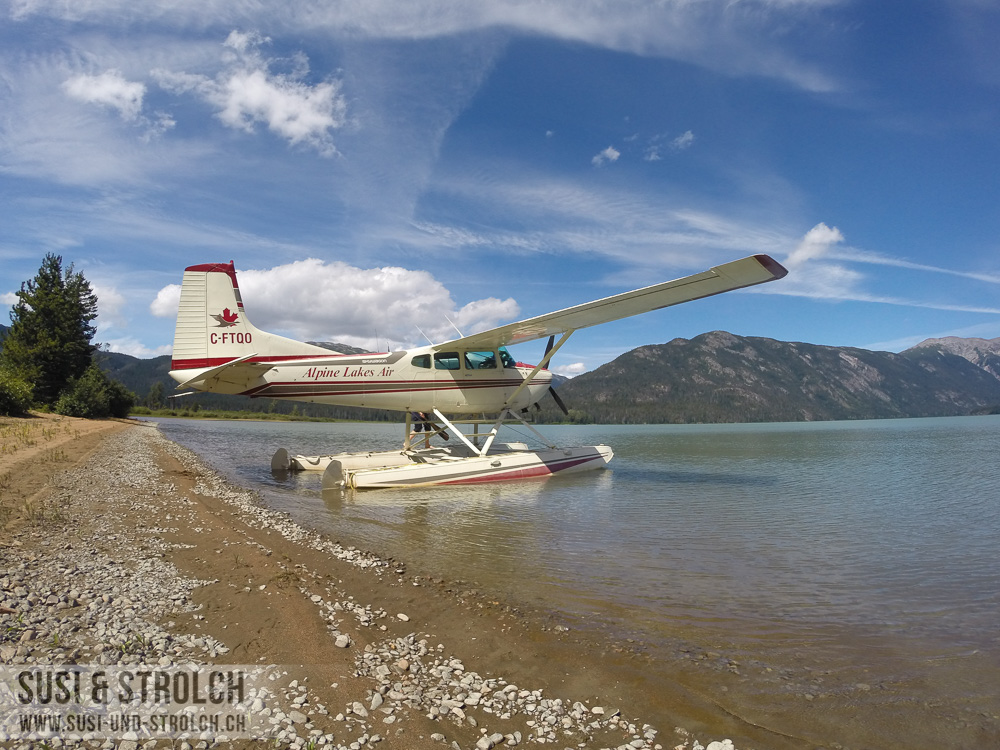 Nach dem Frühstück fuhren wir los. Der See, an dem das Unternehmen operiert, lag rund 20 Minuten ausserhalb von Smithers. Die Firma Alpine Lakes Air wird durch einen Schweizer betrieben, auch ist unsere Pilotin Erin (eigentlich Severine) eine ausgewanderte Schweizerin. Suu hat die „3 Lakes Tour“ ausgesucht, welche gemäss Programm 1h45 dauert und die Landung auf drei Seen beinhaltet – genial, oder :)?! Für Suu war es das erste Mal in so einem kleinen Flugzeug. Neu für mich war vor allem der Start und danach die Landungen auf dem Wasser … echt ein Erlebnis! Ich durfte im Cockpit neben der Pilotin Platz nehmen und kurz darauf sind wir auch schon gestartet.
