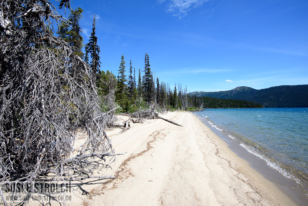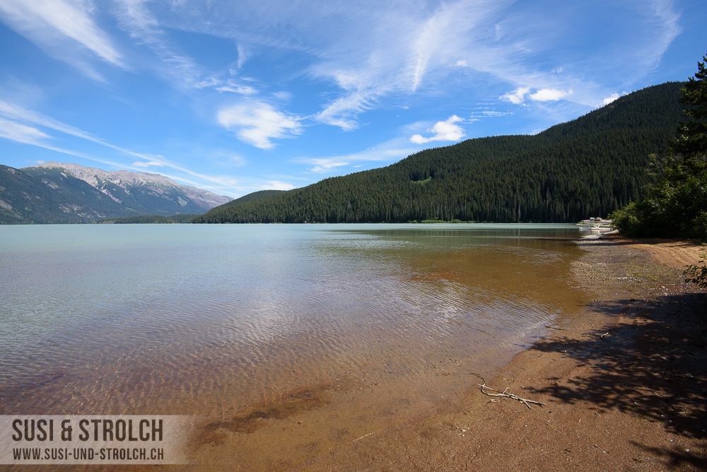 Wie flogen über die unberührte Natur Kanadas, und hatten einen tollen Blick auf die unzähligen Seen, Wälder, Sumpflandschaften, Täler, Gebirge und Gletscher. Wir flogen über Gebiete, zu denen keine Strassen hinführen und, so die Pilotin, wahrscheinlich noch praktisch kein Mensch vorher betreten hatte. Es war ein unglaubliches Gefühl!! Auch Suu verspürte ein unglaubliches Gefühl, nur leider wurde ihr beim Fliegen ein bisschen schlecht [Anmerkung Suu: „ein bisschen“ ist gut…. 😛 Während Dominique die Aussicht auf die kanadische Landschaft genoss, genoss ich derweil die Aussicht in kanadische Kotztüten, haha!]. Die frische Luft nach der ersten Landung auf einem abgelegenen See kam dann gelegen 🙂 Die Piloten landete souverän auf dem Nanika Lake, an dessen Ufer wie uns die Beine vertreten konnten. Wir waren die einzigen weit und breit! Dann ging es wieder in die Luft, wir überquerten den Morice Lake und landeten auf dem Atna Lake. Auch hier – keine Menschenseele, nur Abdrücke von wilden Tieren, unter anderem von Wolfspfoten! Die Pilotin nahm es sehr easy mit der Zeit und hatte keinerlei Stress. Schliesslich haben wir dann aber auf die letze Zwischenlandung verzichtet und sind direkt zur Basis zurückgeflogen – die Tour dauerte ohnehin bereits doppelt so lange, wie sie angekündigt war. Danke nochmals an Suu für dieses tolle Erlebnis :D!!!