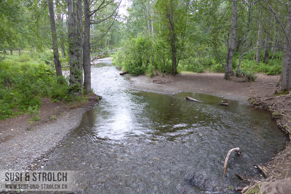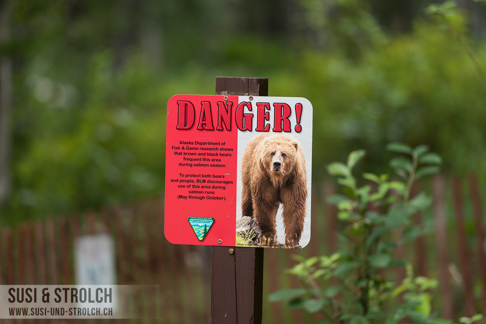 Vormittags machen wir noch einen schönen Spaziergang etwas ausserhalb von Anchorage. Der Campbell Tract ist ein grosses Waldstück und beherbergt anscheinend eine grosse Vielzahl an Wildtieren. Alle paar Meter stehen Warnschilder wegen den Bären, die hier anscheinend ansässig sind und vermutlich regelmässig für Probleme sorgen. Ja, wir sind in der Zivilisation angelangt, wo das Zusammenleben von Mensch und Tier leider nicht so harmonisch ist wie im Lake Clark National Park! Etwas mulmig wird da einem schon, wenn man so hilflos zu Fuss durch den dichten Wald spaziert. Jeder Jogger, jeder Spaziergänger, jeder Hunde-Gassi-Geher ist mit einem Bärenspray „bewaffnet“ – wir natürlich auch. Zahlreiche Spuren von Bären konnten wir entdecken, eine persönliche Begegnung mit Meister Petz gabs aber leider / zum Glück nicht. Trotzdem war der Spaziergang richtig schön und wir sind etwas traurig, war das in unseren Ferien nicht öfters möglich… Aber bei Regen durch die Gegend spazieren ist einfach nicht sooo verlockend 🙁