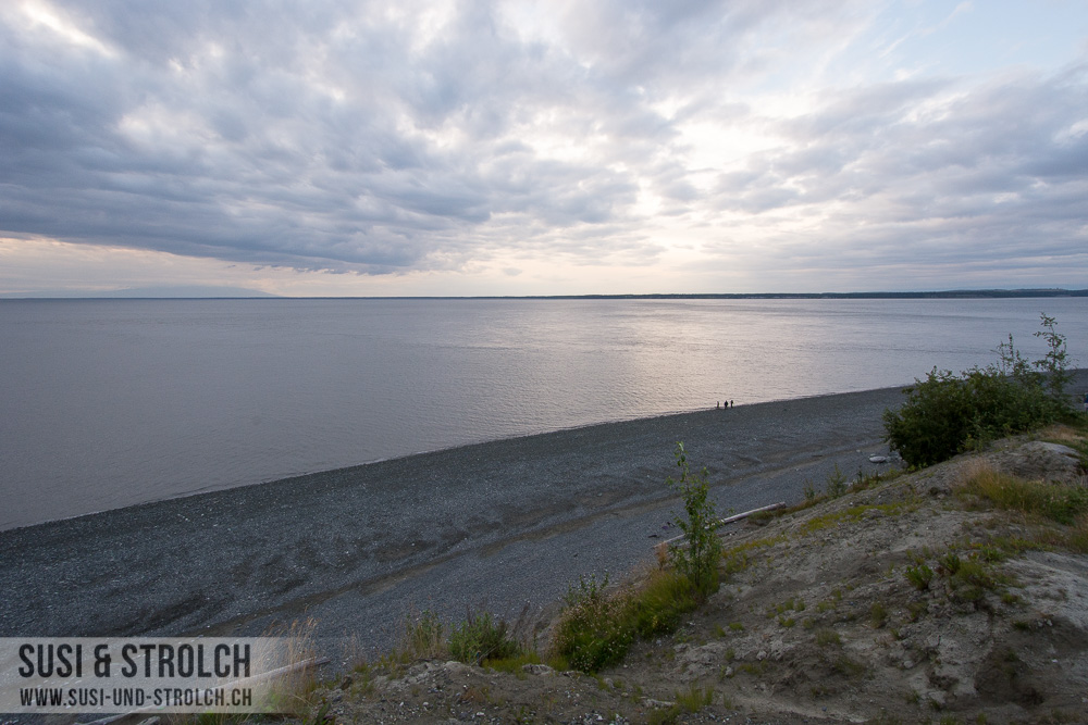 Abends fuhren wir zum Point Woronzof. Leider blieb uns der Sonnenuntergang dort verwehrt – es gab einfach keine Sonne, die untergehen konnte 🙁 Aber spannend war es dort trotzdem, befindet sich dieser Aussichtspunkt doch direkt am Anfang des Knik Arms (Meeresarm) und neben dem Flughafen. So durften wir mehrere riesige Flugzeuge aus unmittelbarer Nähe beim Landeanflug beobachten.