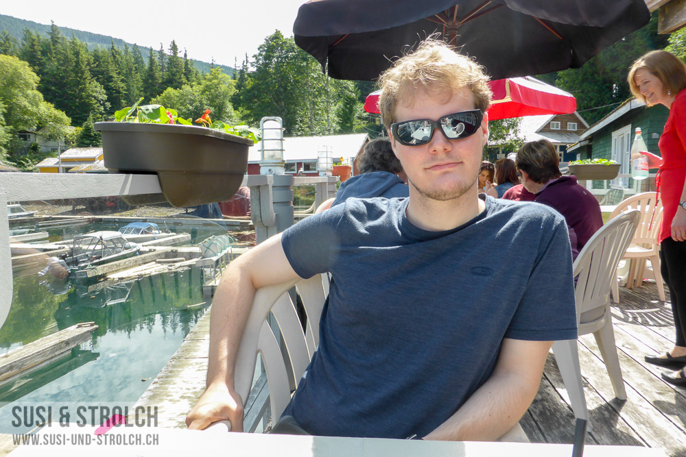 Die heutige Wal-Tour hatten wir bei Stubbs Island Whale Watching gebucht. Etwa eine Stunde vor der Abfahrt erkundigten wir uns nach dem Treffpunkt, da wir ohnehin in der Nähe waren. Telegraph Cove ist ja so klein und alles nahe beieinander. Eine Office-Mitarbeiterin, die sich später als Mitinhaberin Heike herausgestellt hat, sagte uns, dass wir die einzigen angemeldeten Passagiere seien – und das auf einem 49-Passagier-Boot. Sie bot uns an, anstelle auf die heutige 17:30-Tour auf die morgige 9.30-Tour mitzukommen – dies kostenlos und mit der vollen Rückerstattung der Kosten für die heutige Tour. Was seltsam klingt, macht Sinn: Mit einem solchen grossen Boot nur für 2 Passagier rauszufahren, ist nicht rentabel, im Gegenteil. Es wäre für sie also lukrativer, uns kostenlos am Folgetag mitzunehmen, also nur mit uns beiden die Tour zu machen. Da wir am Folgetag aber die Fähre nach Port Hard gebucht hatten, war dies für uns keine Option. Nur schon aus ökologischen Gründen kam es für uns aber nicht in Frage, dass sie mit dem grossen Boot extra für uns rausfahren würden.