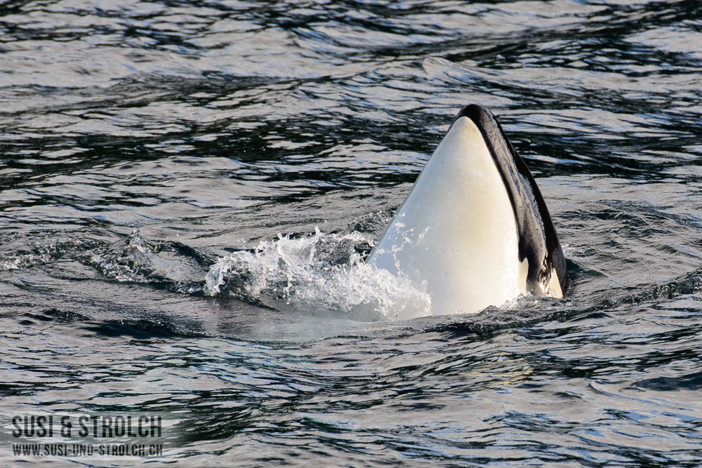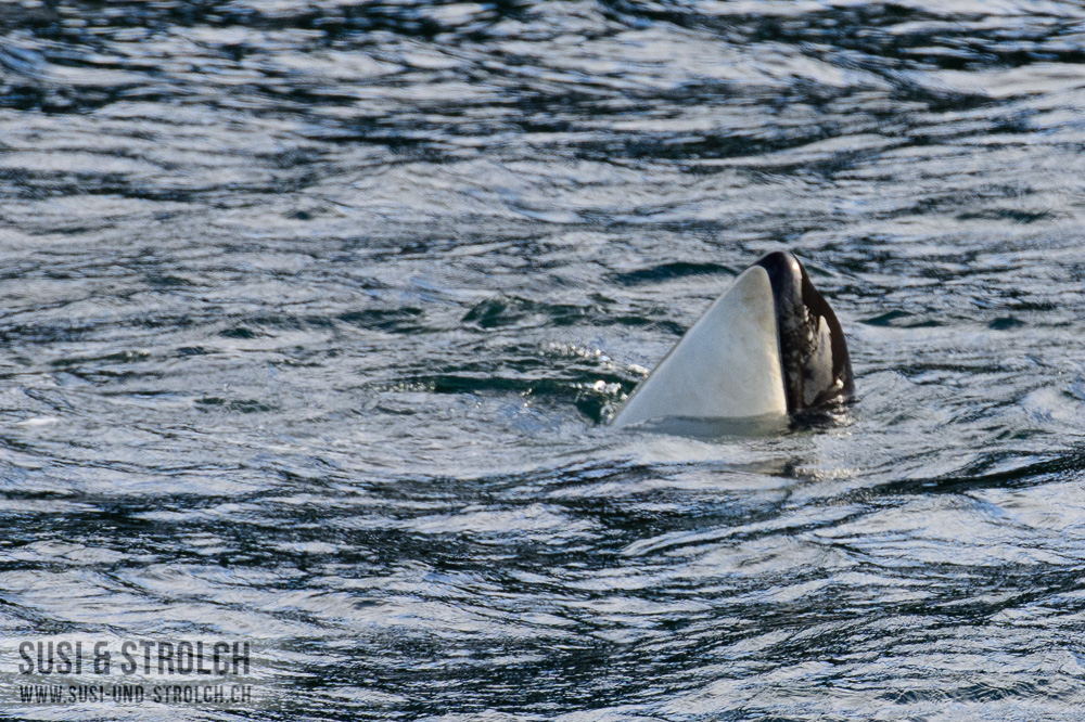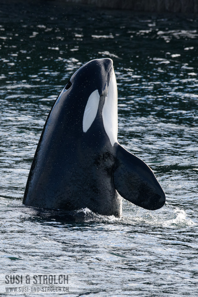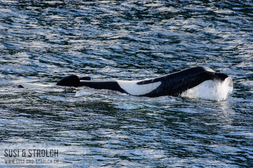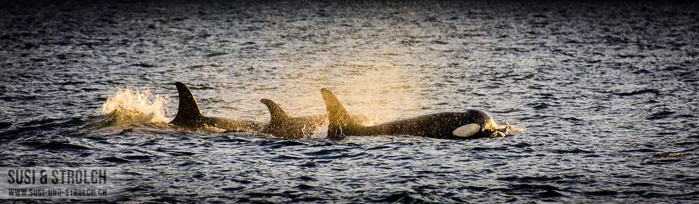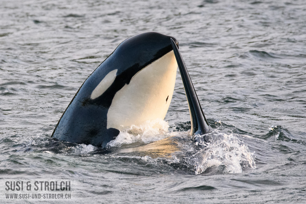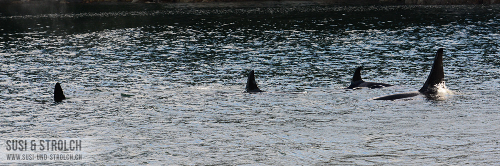 Wir entschieden uns also für einen Refund des gezahlten Betrages. Im gleichen Zug fragte ich, ob sie den kein anderes, kleineres Boot hätten, mit dem wir rausfahren könnten. Heike überlegte einen Moment und sagte dann „I have an idea!“. In der Tat hatten sie ein zweites Boot. Damit wollten sie heute aber keine Tour mehr machen, viel mehr wollten sie dieses zwecks Unterhalt heute noch in einen anderen Hafen bringen und gegen ein anderes Boot tauschen. Kurzerhand nahm sie uns zusammen mit dem Kapitän Roger und Schnauzer Cleo mit auf diese Tour. Und wir hatten Glück! Nach rund 1.5 Stunden – so weit wäre das reguläre Tour-Boot gar nicht gefahren – entdeckten wir zwei Orca-Gruppen. Da auch Heike und Roger nach wie vor von diesen Tieren fasziniert sind, hatten wir genügend Zeit, die Orcas zu fotografieren und zu bestaunen. Es war einfach fantastisch und unglaublich schön, den Tieren zuzuschauen! Die Tiere haben „Socializing“ betrieben und wir konnten sie längere Zeit beobachten. Sie zeigten Verhalten wie Spy Hopping (mit dem Kopf und den Flossen aus dem Wasser) und Tail Slapping (mit der Schwanzflosse aufs Wasser klatschen) und das so aktiv, dass selbst unser Kapitän und Heike begeistert waren! Am Hafen angekommen lernten wir noch eine Meeresbiologin kennen, die uns anhand der Fotos genau sagen konnte, welche Orcas wir getroffen haben. Das war einerseits die Gruppe A23 (Ripple, Fife, Midsummer und Fern) sowie A25 (Surge und Cordero). Auch der Rest der Tour war toll: Es war eine vierstündige Privattour durch die atemberaubende Natur Kanadas. Und das beste: Da es keine offizielle Tour war, erhielten wir den vollen bezahlten Betrag zurückerstattet. Eine Privat-Tour und das auch noch gratis – was für ein Glück 🙂