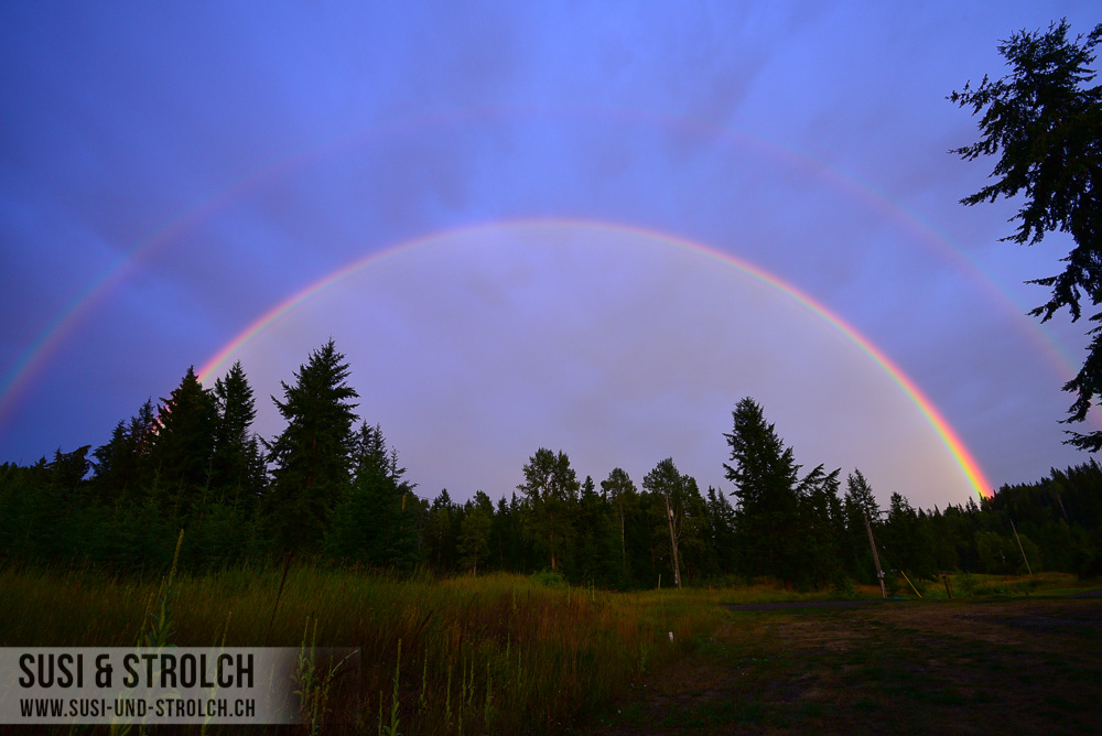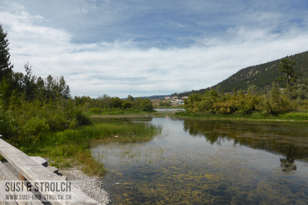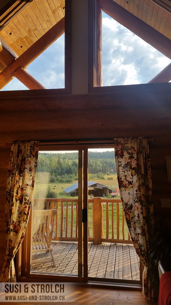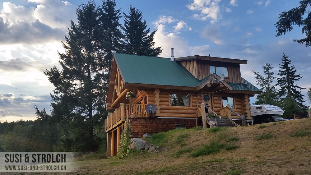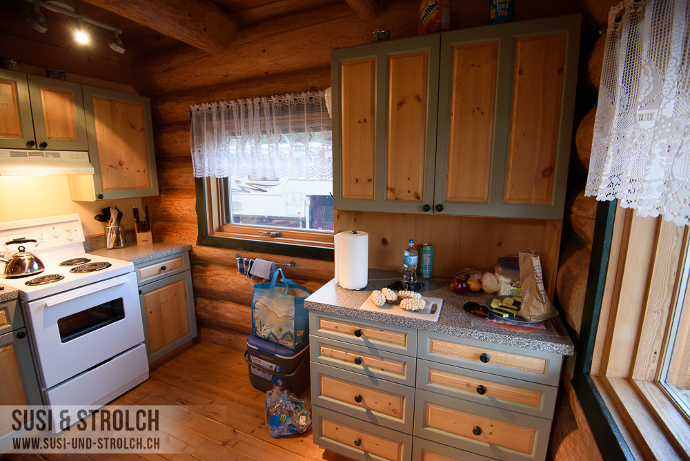 Am Sonntag war ein Fahrtag, von Prince George aus sollten wir bis zu unserem nächsten Ziel kommen: Die Kayanara Ranch ca. 35min ab 100 Miles House. Einen Mittagsstopp mit Sandwichs machten wir bei der „Scout Island“, Wildtiere sahen wir zwar keine, aber es war trotzdem schön. In 100 Miles House (das nächste Kaff von der Ranch aus!) kauften wir für die nächsten Tage ein und fuhren dann die letzten 35min bis zur Kayanara Ranch. Diese Ranch wird von einem Ehepaar aus der Schweiz geführt und war uns im Internet so sympathisch, dass wir sofort eine Blockhütte dort gebucht haben. Auf der Ranch wurden wir von Connie in Empfang genommen und uns wurde alles gezeigt. Zum Abendessen machten wir Rindsfilet mit Baked Potatoes und Grillgemüse auf dem offenen Feuer 🙂