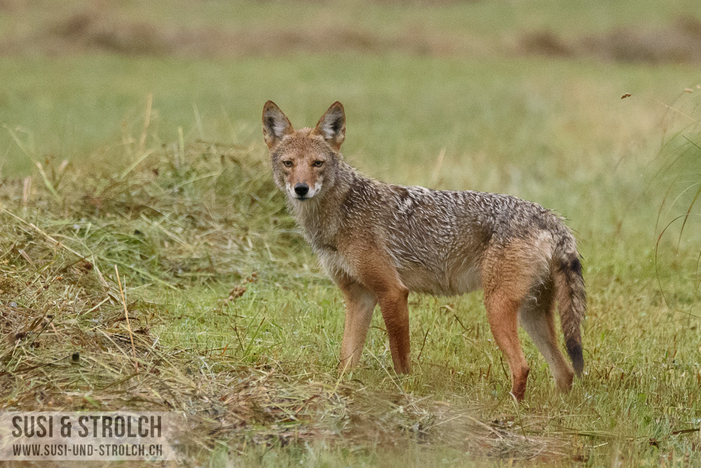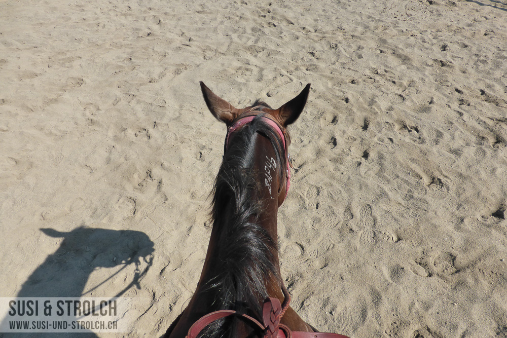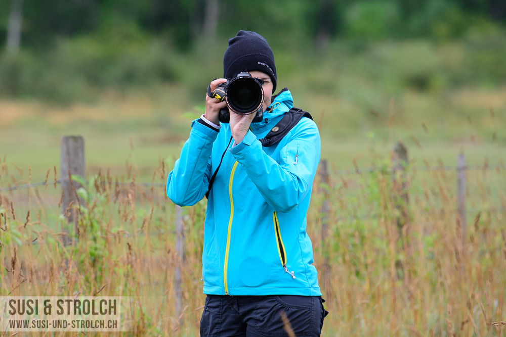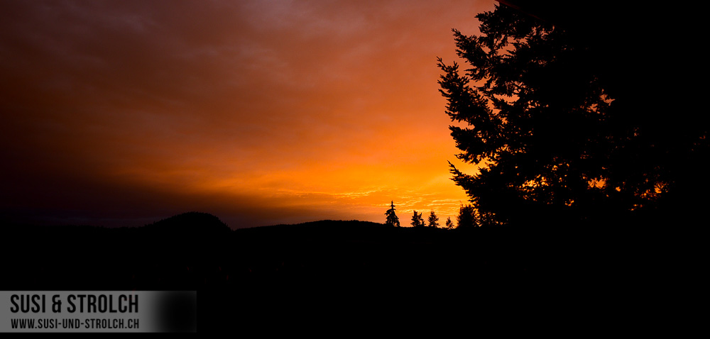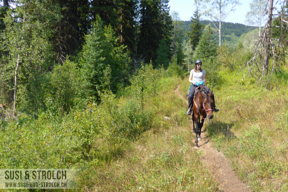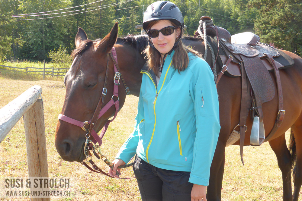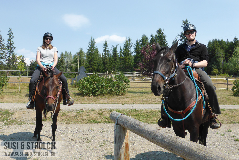 Am Dienstagmorgen sind wir früh aufgestanden, um zu Fuss durch die Wälder zu ziehen. Vor unserer Blockhütte graste ein riesiger Hirschbulle mit seiner Kuh, leider waren sie schon weg, als wir die Kamera griffbereit hatten. Wir sind mehr als eine Stunde in der Dämmerung herumspaziert und eines meiner Ziele konnte ich heute abhaken: Wir sahen einen Kojoten! Genau genommen sogar zwei, aber die beiden waren zu weit weg – den ersten kriegten wir immerhin schnappschussmässig aufs Bild, bevor er davonrannte. Nach dem Frühstück gingen wir dann ausreiten, yeah. Zuerst gab es eine Reitstunde für uns, die wirklich super gestaltet wurde von der Schweizer Volunteerin! Uns wurden die wichtigsten Basics gezeigt und auch alle wichtigen Eigenschaften des Pferdes erklärt. Wirklich super gemacht alles. Dominique durfte mit „Masu“ ausreiten, ich bekam „Yuma“, ein Rieeeeeesentier! Angeblich ist sie ein bisschen stur und will immer fressen, um dann in unbequemem Trab wieder hinter der Gruppe herzuhetzen. Wir verstanden uns aber bestens und nachdem sie anfangs zwei, dreimal versuchte zu fressen und ich es gleich energisch unterbunden habe, klappte der ganze Ausritt ohne jegliche Probleme. Es war schon ein geniales Erlebnis, zwei Stunden mitten durch die kanadische Wildnis zu reiten! Keine Strassen, keine Menschen, keine Geräusche – ausser die Natur. Den Nachmittag verbrachten wir mit Lesen und Schlaaaafen 🙂 Um 20:15h gingen wir an eine Präsentation von Connie und Dani, an dem vor allem Dani auf sehr eindrücklichi Art und Weise von der Auswanderung erzählte. Zum Abendessen gab es nochmal so ein leckeres Rindsfilet, yam yam.