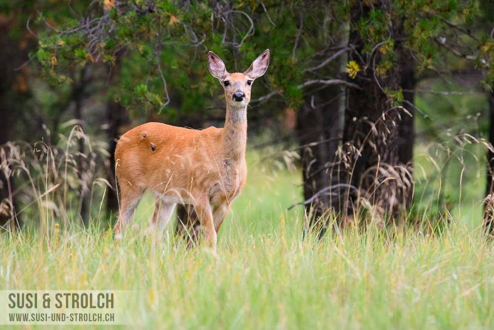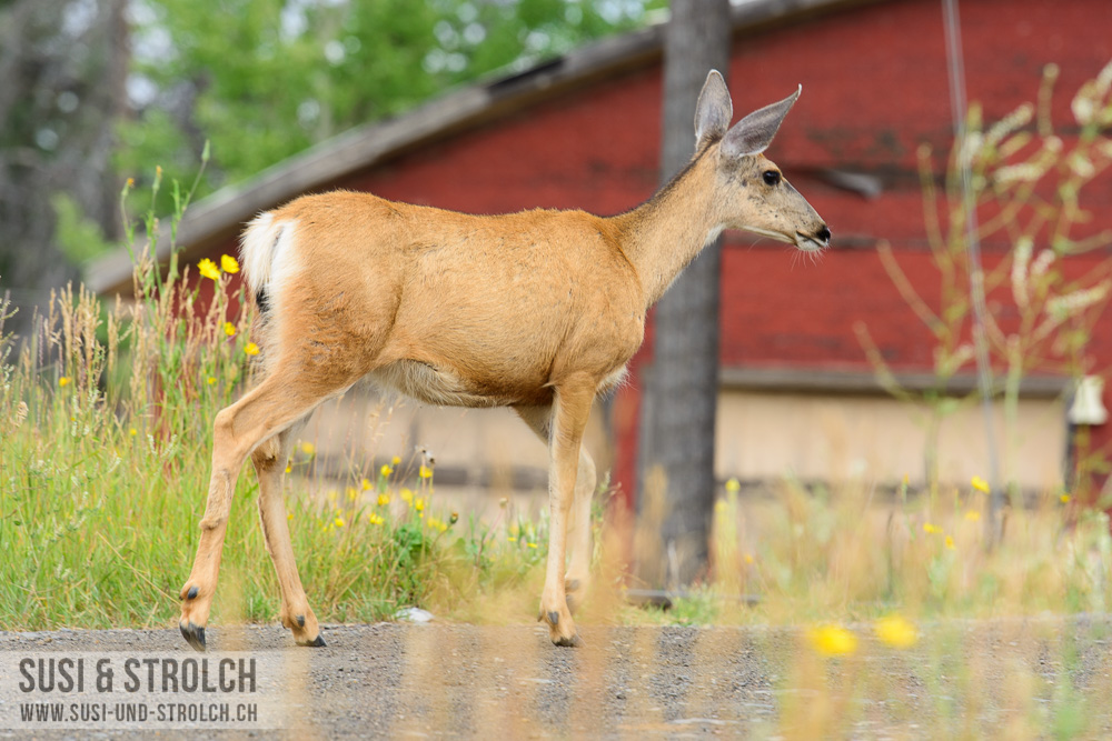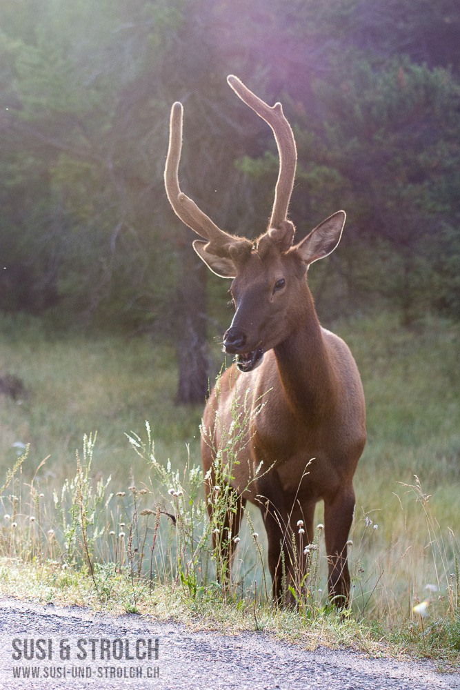 Völlig geflasht von diesem Erlebnis 😀 spazierten wir zurück zum Parkplatz, gönnten uns noch ein Mittagessen im Restaurant (inzwischen doch sehr voll mit Touris) und fuhren dann zurück zu unserer Hütte. Das Wetter war leider wieder mies und es regnete, so dass wir die weiteren Pläne für heute über den Haufen werfen mussten. Nach dem Abendessen (wieder Steak vom eigenen Grill) machten wir noch eine Autofahrt gen Norden, abgesehen von drei scheuen Mule Deers und einem Wapiti aus der Ferne sahen wir aber leider keine Tiere…