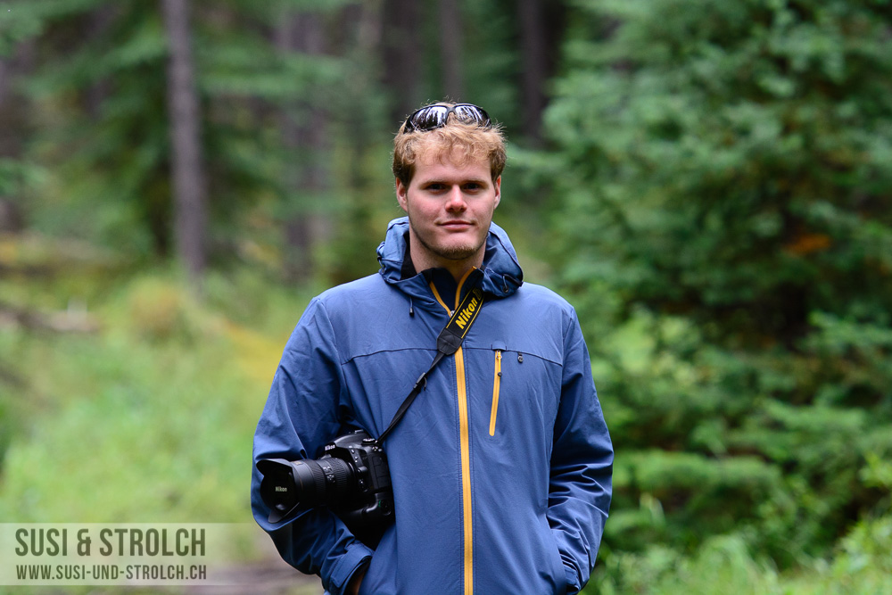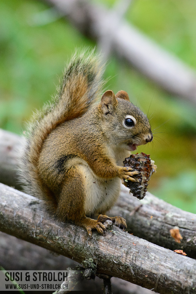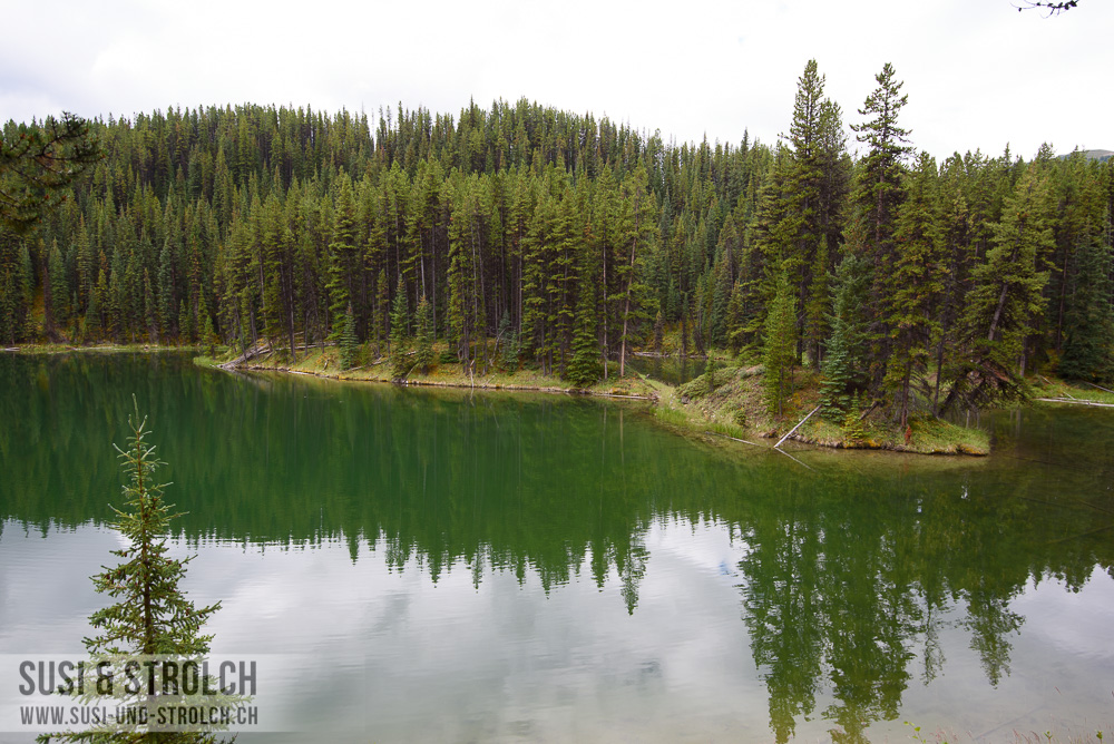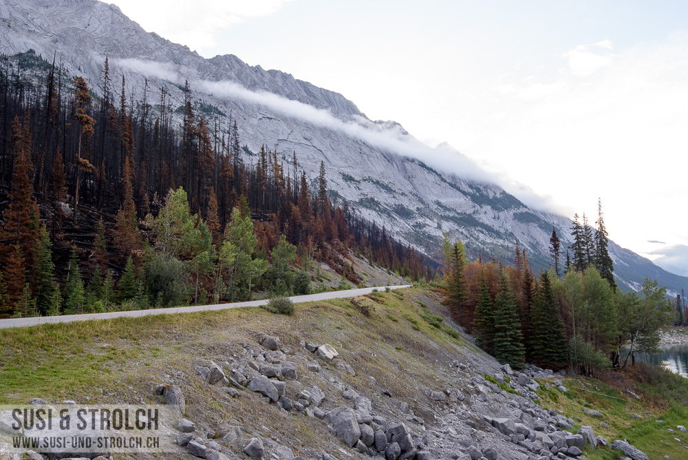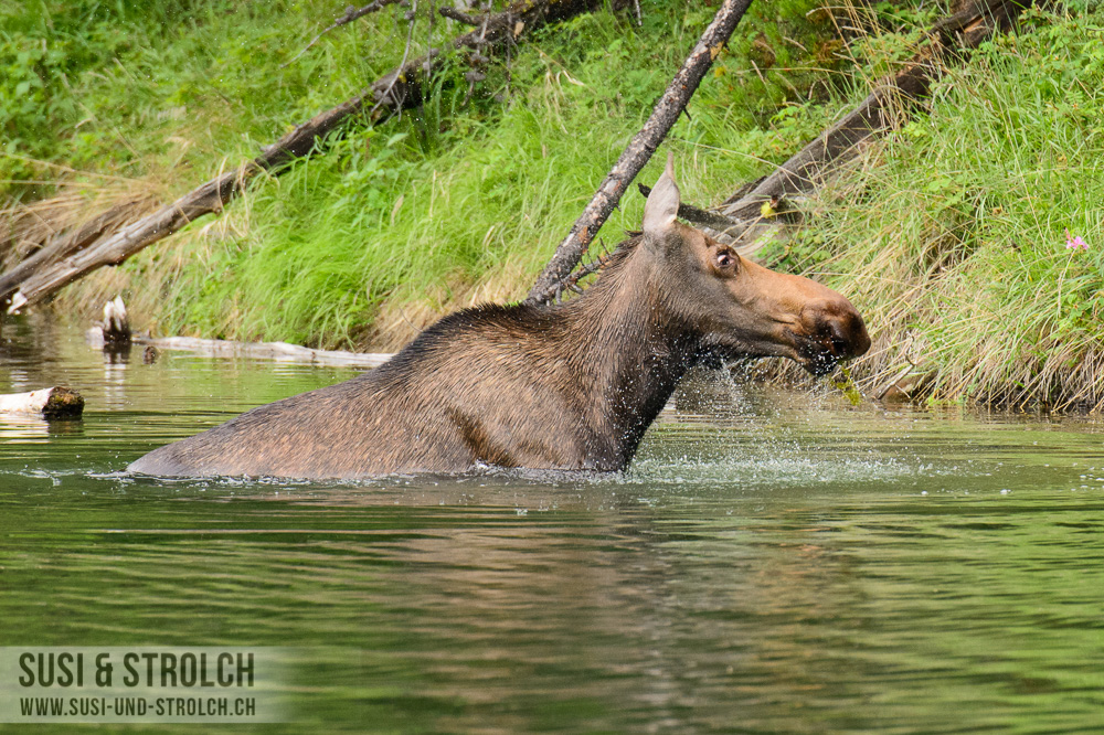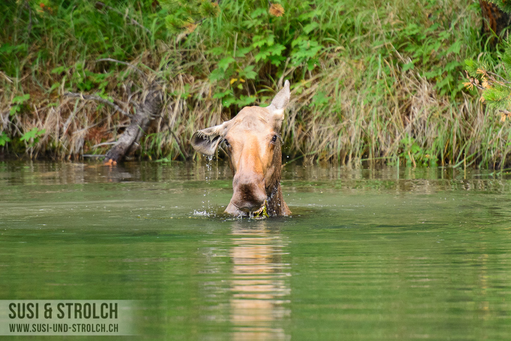 Am Donnerstagmorgen wollten wir früh los, das Bett war aber zu schön kuschlig warm 😉 Bei 4 Grad draussen war Aufstehen nicht sooo verlockend, so schafften wir es erst um 8 Uhr los mit Miss Roger. Bereits ausgangs Jasper sahen wir mehrere Mule Deers oder Elks, wo sicher waren wir uns nicht 😉 Auf den restlichen 40km bis zum Malign Lake sahen wir leider keine Tiere mehr… In der Gegend des Medicine Lakes bot sich uns ein trauriger Anblick: Anfangs Juli wütete hier ein Waldbrand und hat ein grosses Gebiet regelrecht verkokelt. Am Malign Lake waren wir noch fast alleine – das frühe Aufstehen hat sich also gelohnt! Nach einem zweiten Frühstück im noch leeren Restaurant entschieden wir, ein bisschen spazieren zu gehen. Wir wollten einfach ein bisschen dem „Moose Lake Trail“ entlang spazieren und dann umkehren. Aber es war so wunderschön, durch diese Natur zu gehen, dass wir bis zum Moose Lake wanderten. Dort entdeckten wir ein herziges Eichhörnchen, das sich sehr fotogen zeigte und wir konnten es längere Zeit beobachten. Irgendwie waren wir vom eigentlichen Wanderweg abgekommen, entschieden aber nun halt den See zu umrunden. Plötzlich hörten wir ein Platschern und dann geschah etwas, was wir ja nie für möglich gehalten hätte… 10m vor uns stieg eine Elch-Kuh ins Wasser! Ich traute meinen Augen kaum, ist somit doch mein letztes Wildlife-Ziel dieser Reise erfüllt: Ich erlebe einen Elch in freier Natur! Auf zwei Yellowstone-Reisen habe ich diese imposanten Tiere vergeblich versucht und auch auf dieser Kanada-Reise fuhren wir einen ganzen Tag durch ein Gebiet mit so vielen Elchen, dass sehr oft welche am Strassenrand gesehen werden. Nie hatte ich Glück – und nun dieses Erlebnis. Die Elch-Dame schwamm direkt vor uns auf die andere Seeseite und tauchte dort völlig entspannt nach Wasserpflanzen. Wir sassen still am Ufer und genossen den Augenblick, machten Fotos und Filme und beobachteten dieses eindrückliche Tier während längerer Zeit. Was für ein unglaubliches Glück wir doch haben auf dieser Reise!