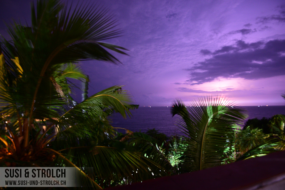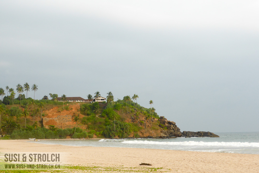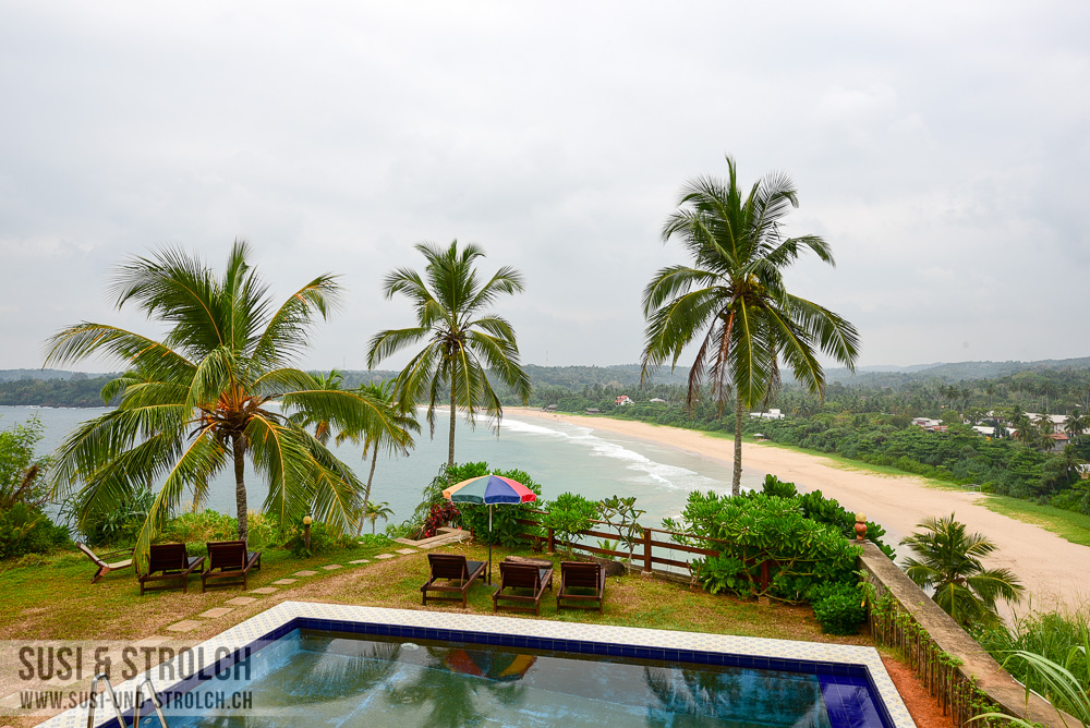Die letzten 200 Meter gingen wir zu Fuss. Unser Hotel, das Hotel Panorama Talalla Beach, lag auf einer kleinen Erhöhung direkt am Meer, die steile, unbefestigte Zufahrtsstrasse war jedoch in so einem schlechten Zustand, dass wir den Fahrer mit seinem Sport-Honda diese nicht mit gutem Gewissen haben hinauffahren lassen können. Das von ausgewanderten Tschechen geführte Hotel war ganz OK für 2 Nächte, wenn es mit USD 109 pro Nacht auch etwas überteuert war. Der kleine Kühlschrank im Zimmer sah aus, als ob darin ein Frosch explodiert wäre. Dieser [der Kühlschrank, nicht der Frosch] wurde jedoch gereinigt und mit Getränken gefüllt, nachdem wir es gemeldet hatten. Das Bewusstsein für Sauberkeit scheinen die lokalen Angestellten ohnehin nicht zu haben, wie wir bereits mehrfach festgestellt haben. Eigentlich sind wir der Auffassung, dass Sauberkeit keine Frage des Zimmerpreises sein sollte, also dass ein Zimmer bei jedem Preis sauber sein sollte. Meistens ist es aber so, dass auch die (im Verhältnis) teureren Hotels kein bisschen besser sind. Darüber haben wir auch hinweggesehen. Etwas mühsam waren jedoch zwei Dinge. Zum einen hatte das ganze Hotel am ersten Abend ab 22 Uhr plötzlich kein Wasser mehr. Ich stand gerade unter der Dusche mit viel Shampoo in den Haaren …. Zum anderen fanden wir am zweiten Tag eine Ameisenstrasse direkt in unsere Necessaires vor. Oh man, bis wir diese endlich wieder ameisenfrei gekriegt haben, das war vielleicht ein Kampf! Abgesehen davon war das Hotel OK, aber wirklich nur OK. Einzig die Aussicht war fantastisch, unser Zimmer hatte sogar Meerblick.