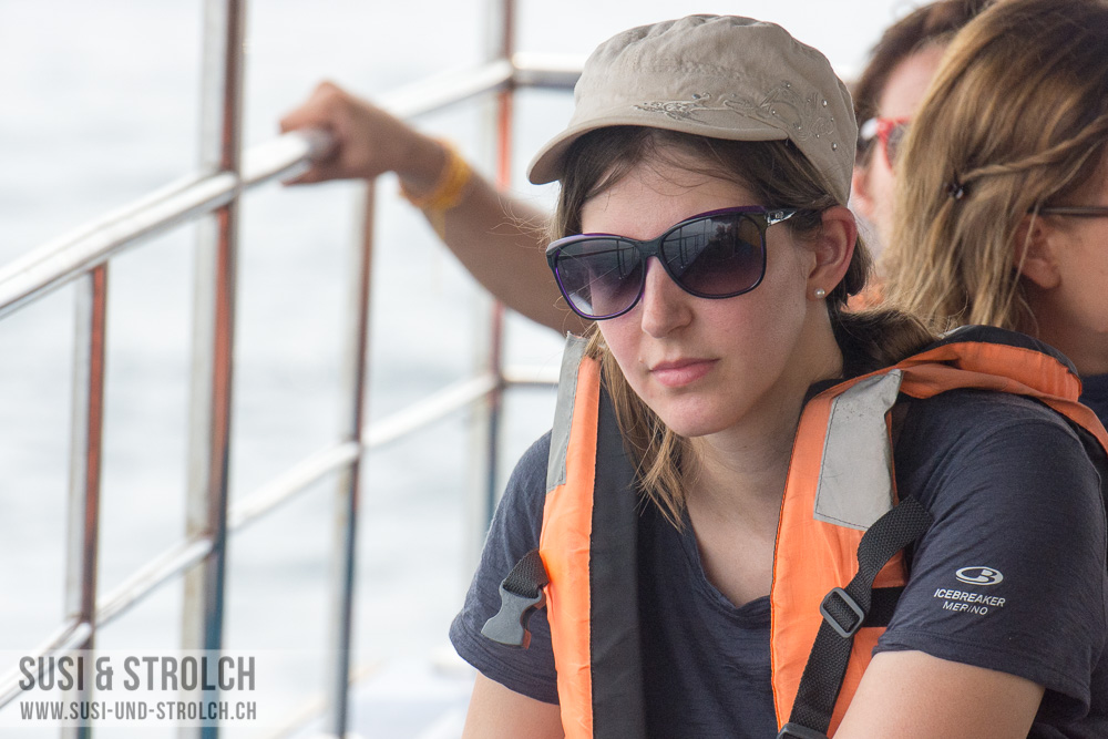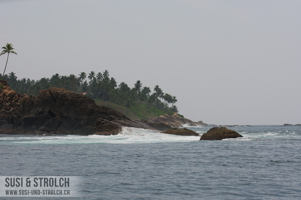 Die Stimmung auf dem Boot war echt toll. Die Sri Lankanischen Jungs waren toll drauf und lachten einen immer an. Man hat gemerkt, dass es nicht nur ein Job ist, sondern eine Passion und dass sie stolz sind, dort zu arbeiten. Auf dem Boot wurde Frühstück zubereitet, es gab zuerst einen Früchteteller – den sie jedem einzelnen Passagier reichten – und anschliessend Toast mit Ei und Würstchen. So liessen sich die 1.5h Fahrt ins Walgebiet gut überbrücken ☺ Plötzlich waren wir von einem Schwarm Delphinen umgegeben, denen wir beim Springen und Tauchen zusahen, bevor wir weiter fuhren. Zudem ertönte auf einmal eine Stimme „Killerwhale! Killerwhale!“. Und tatsächlich! – wir hatten einmal mehr unglaubliches Glück und haben einen Orca zu Gesicht bekommen! Bei ganz wenigen Orca-Sichtungen im Jahr in diesem Gebiet ist das schon etwas Spezielles. Damit nicht genug. Kurze Zeit später haben wir auch noch einen Blauwal gesehen. Dieser war jeweils nur eine kurze Zeit an der Oberfläche und tauchte dann jeweils zwischen 10 und 15 Minuten ab, bis er wieder Luft holte. Hier zeigte sich ein weiteres positives Merkmal für einen professionellen (und dadurch etwas teureren) Tour-Anbieter: Die ganzen Billig-Anbieter machten kehrt, nachdem sie den Blauwal zum ersten Mal gesehen haben. Wer ihn nicht gesehen hat oder kein Foto machen konnte: Pech gehabt. Unser Kapitän wartete drei, vier oder fünf Luftholen-Tauchen-Sequenzen ab, bis er umdrehte. Mit einem humorvollen Unterton wurden wir gefragt „Did you see the whale? So you won’t get your money back!“ ☺ Wir sind uns einig, es war es wert!