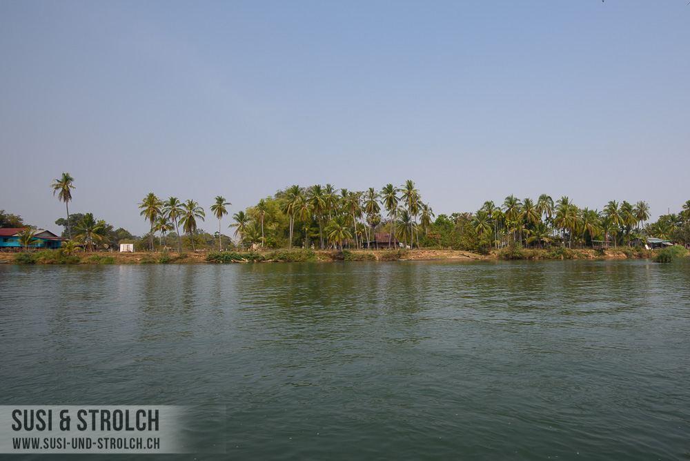 Im Anschluss wurden wir auf dem Mekong quer durch die 4000 Inseln nach Ban Nakasang gebracht, wo wir mit etwas Glück den richtigen Bus fanden. Zuerst mussten wir die Koffer (!) von zwei Reisenden aus dem Bus auf das Dach befördern, welche – entweder aus Unwissenheit oder aus Frechheit – diese im Gang des Busses und zwischen den Sitzen deponierten. Nach rund einer Stunde Fahrt hielt der Busfahrer am Strassenrand plötzlich an und schaute fragend zurück zu den Passagieren. Wir hörten ein Handy klingeln, der Fahrer begann zu wühlen. Er stieg aus, kletterte auf das Dach des Busses, kletterte wieder herunter, stieg ein und schaute wieder fragend in die Runde. Er suchte offensichtlich sein Handy. Sein Kollege auf dem Beifahrersitz rief ihn an uns das Handy klingelte wieder. Die Prozedur wiederholte sich zwei, drei Mal, bis er sein Handy schliesslich auf dem Dach fand. Dies hatte er vermutlich beim Beladen mit den Gepäckstücken dort verloren – ein Wunder, dass es nicht heruntergefallen war. Der Fahrer erntete eine Kombination von Applaus und Gelächter und fuhr weiter.