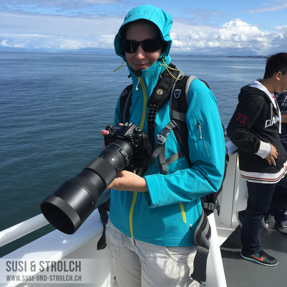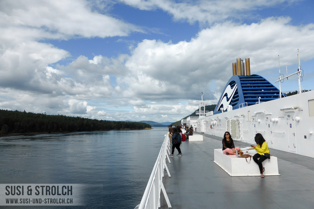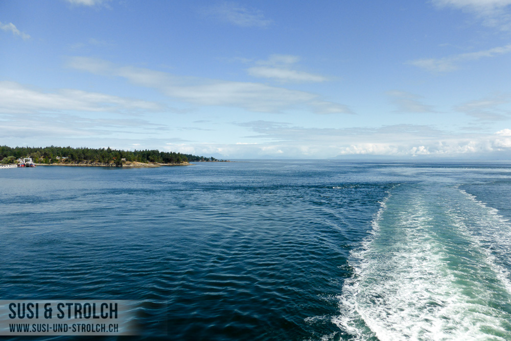So gings erstmals auf dieser Reise im Auto weiter: Auf zum Tsawwassen Fährenterminal. Reserviert hatten wir eigentlich die 11Uhr-Fähre, aber da wir bereits früher dort waren, nahmen wir die um 10 Uhr. „Miss Roger“ wurde also im Inneren der riesigen Fähre parkiert und wir machten es uns auf dem Deck gemütlich. Ein eindrückliches Erlebnis 🙂 Nach etwa 1.5h legten wir in Swartz Bay auf Vancouver Island an und fuhren das Halbstündchen bis Victoria, wo wir das Strathcona Hotel bald fanden. Wir machten uns gleich auf den Weg zum Hafen, assen etwas Kleines zu Mittag und schlenderten zum Hafen, wo wir um 14:30 Uhr unsere erste Walbeobachtungstour begannen.