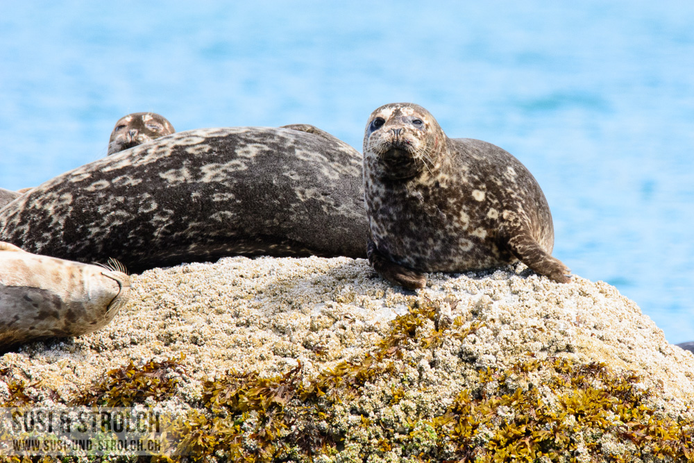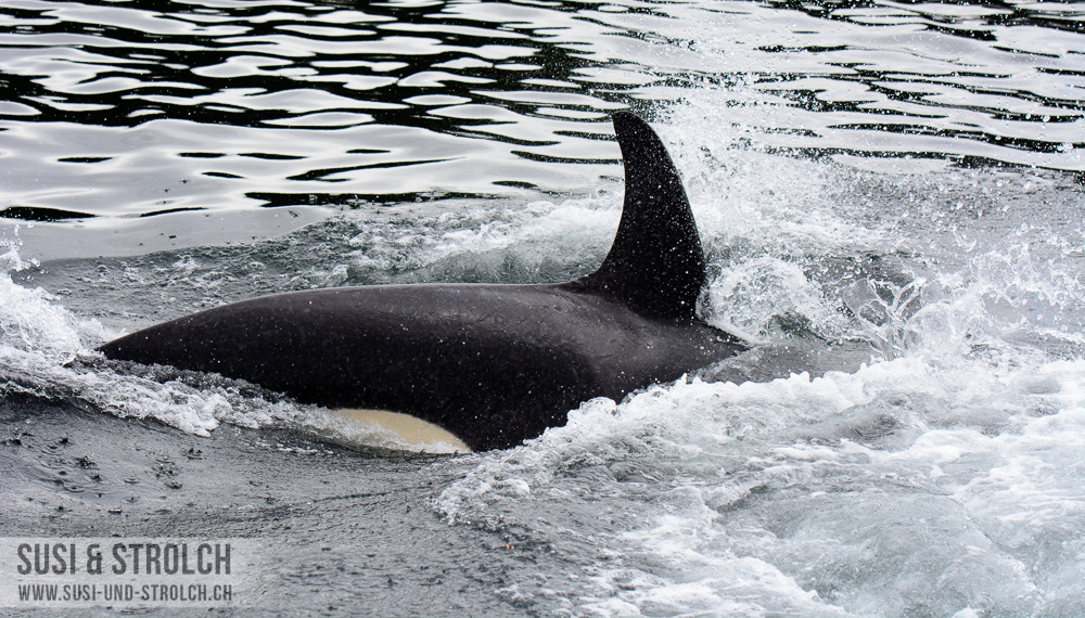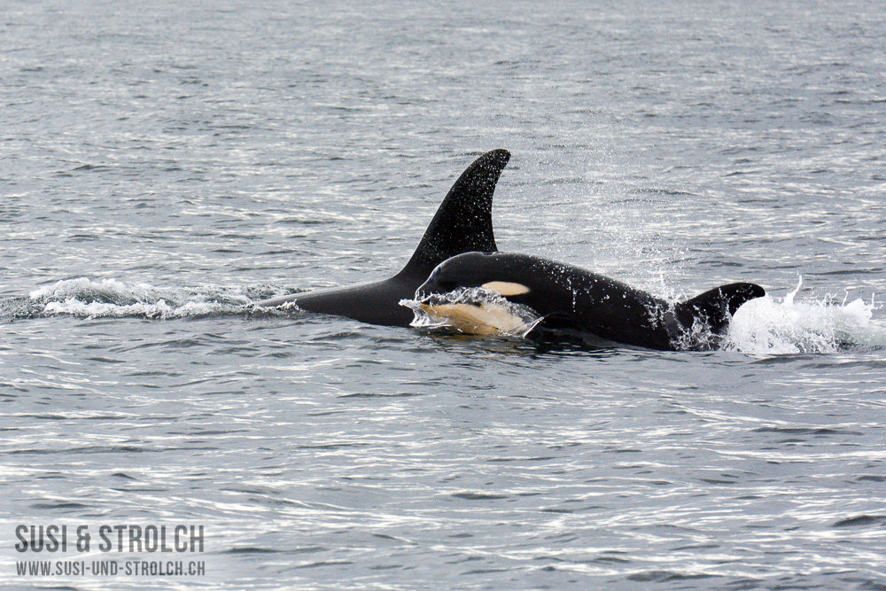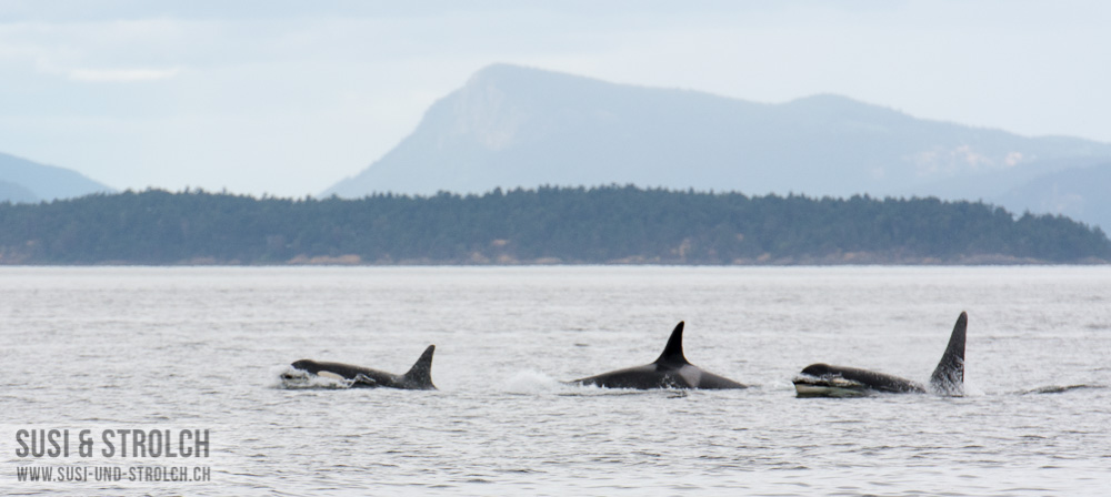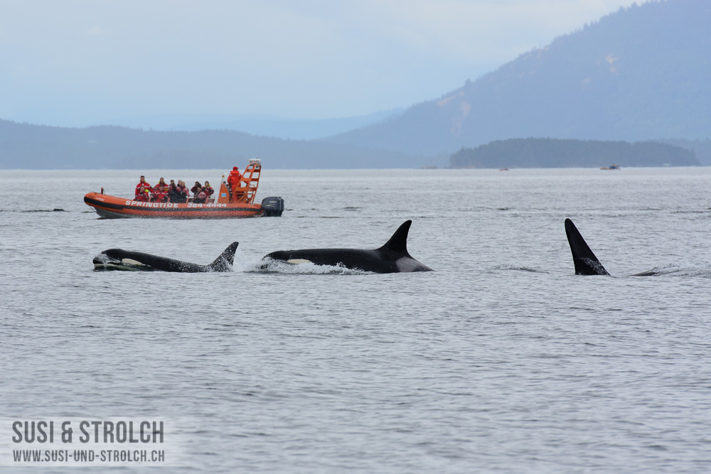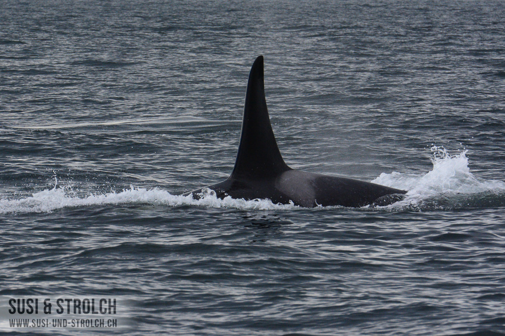Mit „BC Whale Watches“ fuhren wir gut 3 Stunden mit der „BC Luna“ durchs Gewässer vor den San Juan Inseln. Wir hatten Glück! Zuerst sahen wir einige Transients. Das sind die Orcas, die normalerweise in anderen Gebieten leben, im Sommer aber durchziehen, um weiter in den Norden zu gelangen. Später waren wir inmitten einer Gruppe von Residentials. Diese Orcas leben das ganze Jahr über in den Gewässern vor Vancouver Island und ernähren sich von Fisch. Bekannt sind drei Gruppen, die allesamt gut erforscht sind. Bei unserer Gruppe war sogar ein Baby dabei 🙂 Das Fotografieren war allerdings enorm schwierig, gesprungen sind sie leider nicht… Sie tauchten einfach irgendwann irgendwo kurz auf und waren schon wieder weg 😀 Für mich war es doch ein enorm faszinierendes Erlebnis, gehört der Orca doch zu meinen absoluten Lieblingstieren! Unser Guide Jim war der Hammer, man spürte deutlich, dass dies nicht sein Beruf, sondern seine Berufung ist und er diese Tiere über alles liebt.