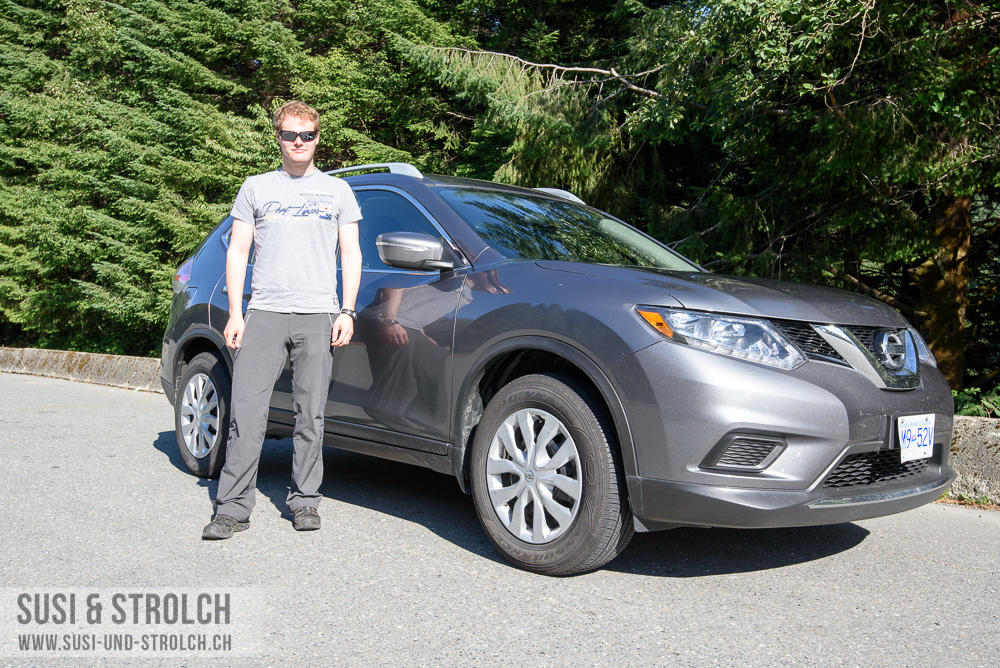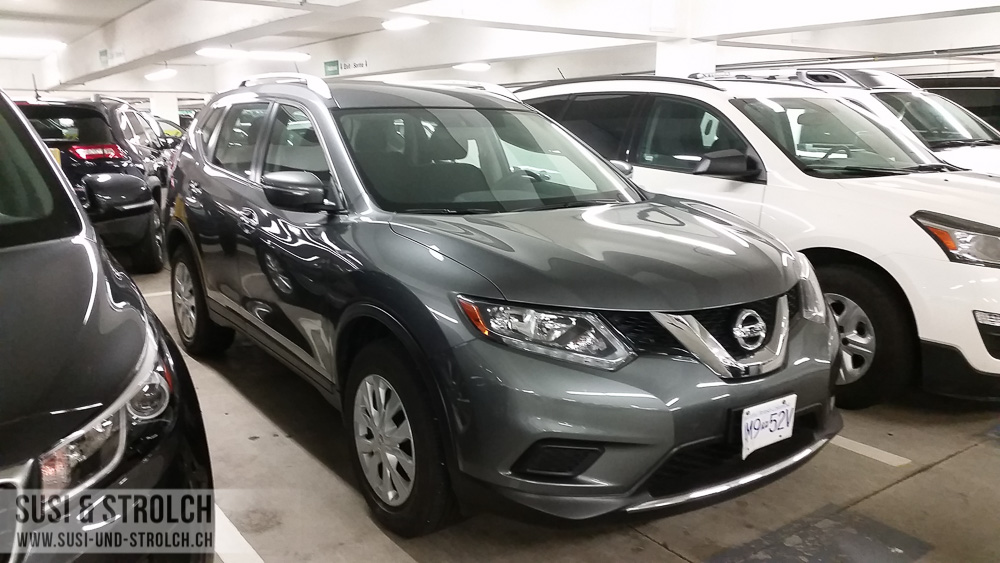 Am Samstagmorgen bestellten wir bereits recht früh ein Taxi, das uns zum Flughafen brachte. Mit den Koffern bis zur Metro-Station latschen war einfach nicht so unsere schönste Vorstellung 😛 Am Flughafen hiess es ausnahmsweise nicht fliegen, sondern Mietwagen entgegen nehmen. Ich war ja schon Tage vorher ganz aufgeregt und nervös und voller Hoffnung, einen coolen Wagen zu kriegen und war dann völlig happy, als ich vor unserem Auto stand: Nissan Rogue in Dunkelsilber, gerade mal 18’178km auf dem Buckel, Baujahr 2015 und mit allem Schnickschnack ausgerüstet, den man sich wünschen kann. Genial! Yeah 😀 😀 😀