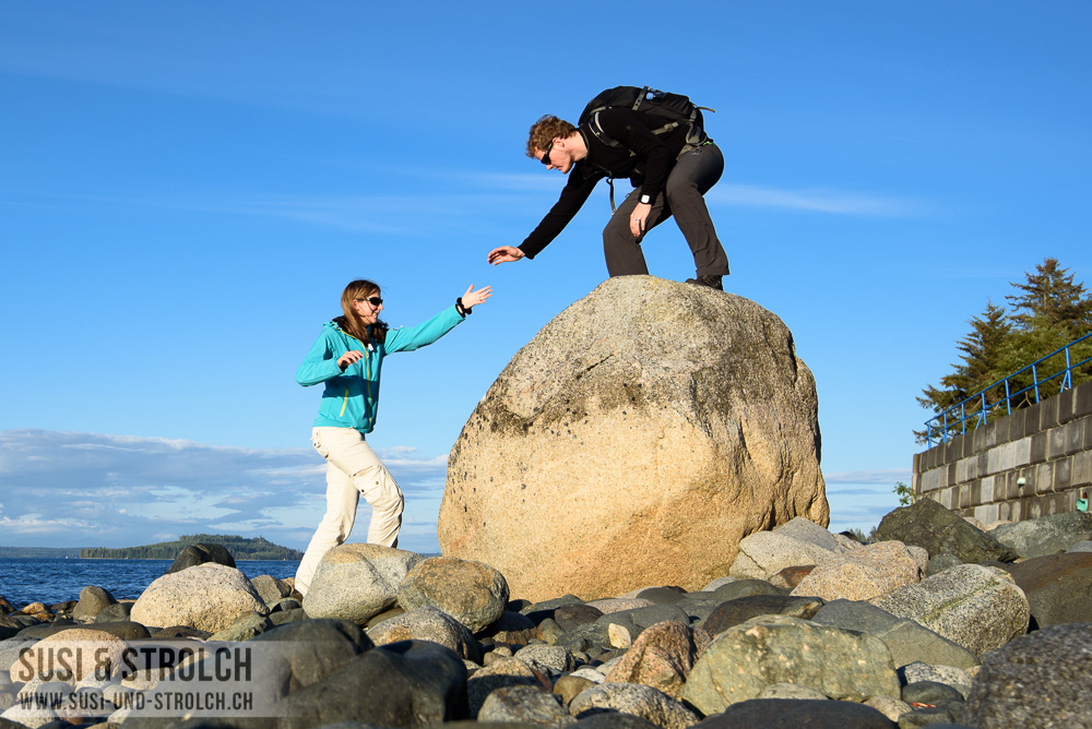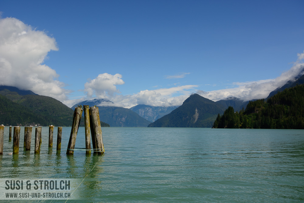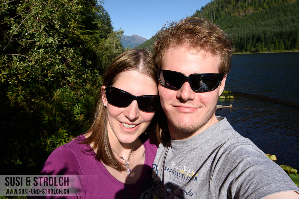Der heutige Tag gehörte eindeutig in die Kategorie „Der Weg ist das Ziel“ und kann als Fahrtag bezeichnet werden. Dominique übernahm zuerst das Steuer, um die gut 450km und voraussichtlichen 5.5h Fahr zu bewältigen. Leider war der erste Teil der Strecke alles andere als angenehm zu fahren und vor allem alles andere als typisch Nordamerika! Alle paar 100m eine Kreuzung mit Ampel, enorm viel Verkehr, den man nicht als flüssig bezeichnen könnte… Als ich übernahm, kamen noch zwei solche Kreuzungen und dann war es so, wie ich es kenne und liebe von den USA. Freiheitgefühl pur, tolle Strassen mit 100kmh, kaum Verkehr! Wir fuhren durch unglaubliche Landschaften. An einem herzigen See gab es eine kurze Pause (und für mich einen sehr schmerzhaften Insektenbiss kostenlos dazu) und kurz nach 19 Uhr erreichten wir auch schon unser Hotel: Haida Way Motor Inn. Abendessen gab es in Form von selbst belegten Sandwiches im Zimmer 😉