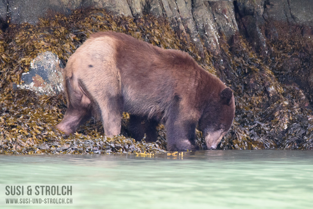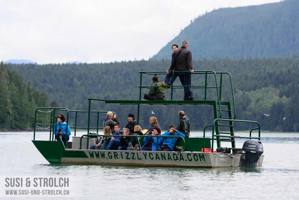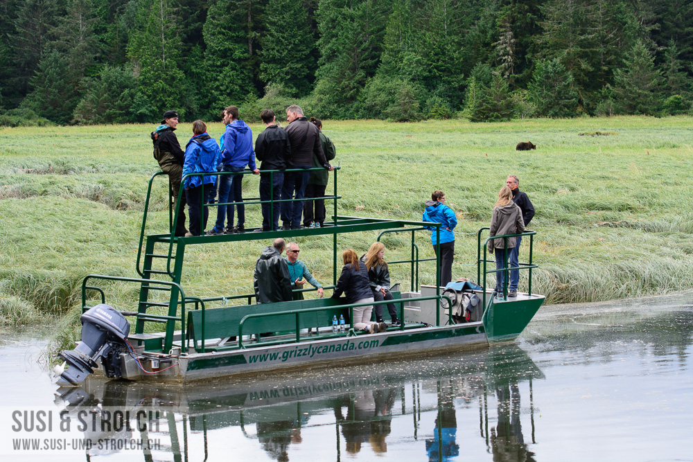 Nach einer Viertelstunde sahen wir gleich zwei Buckelwale und mehrere Weisskopfseeadler. Nach fast 3 Stunden erreichten wir unser Ziel: Ein Gebiet, in dem Frischwasserflüsse mit tiefem Wasserstand in den Meeresarm fliessen. Wir stiegen dort auf spezielle Beobachtungsboote um und los ging es. Nach 5 Minuten hatten wir bereits den ersten Grizzly vor uns! Ein junges Männchen suchte am Ufer nach Muscheln.