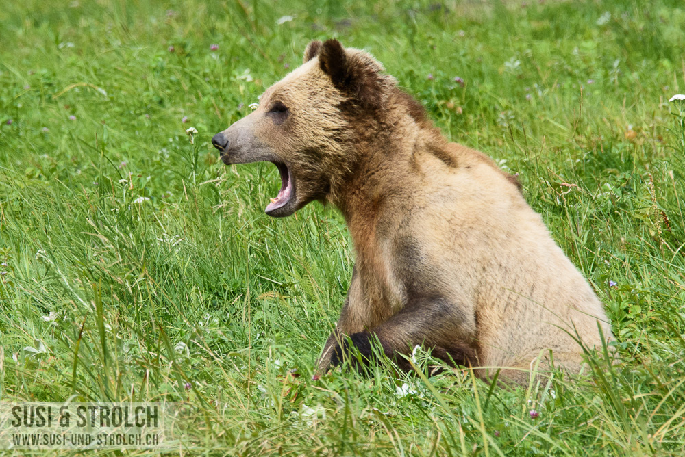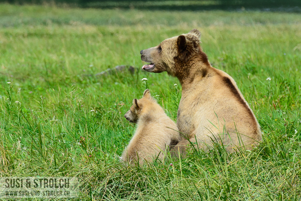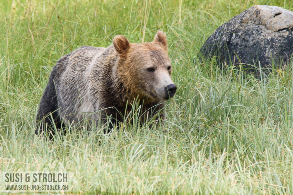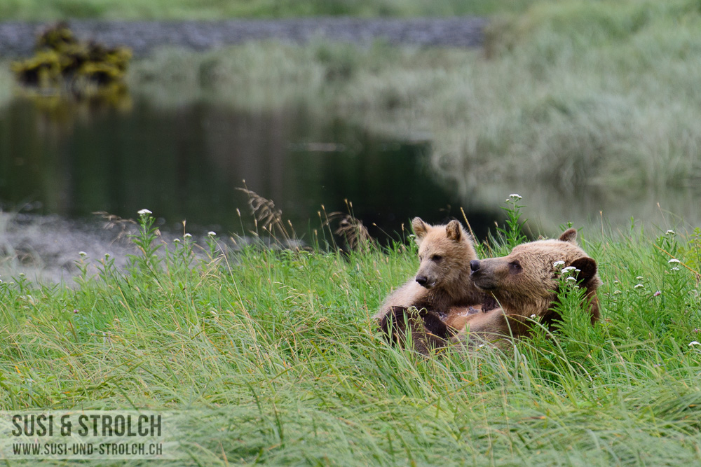 Keine 10 Minuten später folgten gleich drei weitere Grizzlys: Eine Mutter mit ihrem Jungen und einen weiteren ausgewachsenen Grizzly. Diese drei Gesellen beobachteten wir während fast zwei Stunden aus nächster Nähe! Ein unbeschreibliches Erlebnis, irgendwo im Nirgendwo, es ist mucksmäuschenstill und alle anwesenden Leute bestaunen fasziniert diese Tiere inmitten dieser unglaublichen Atmosphäre!