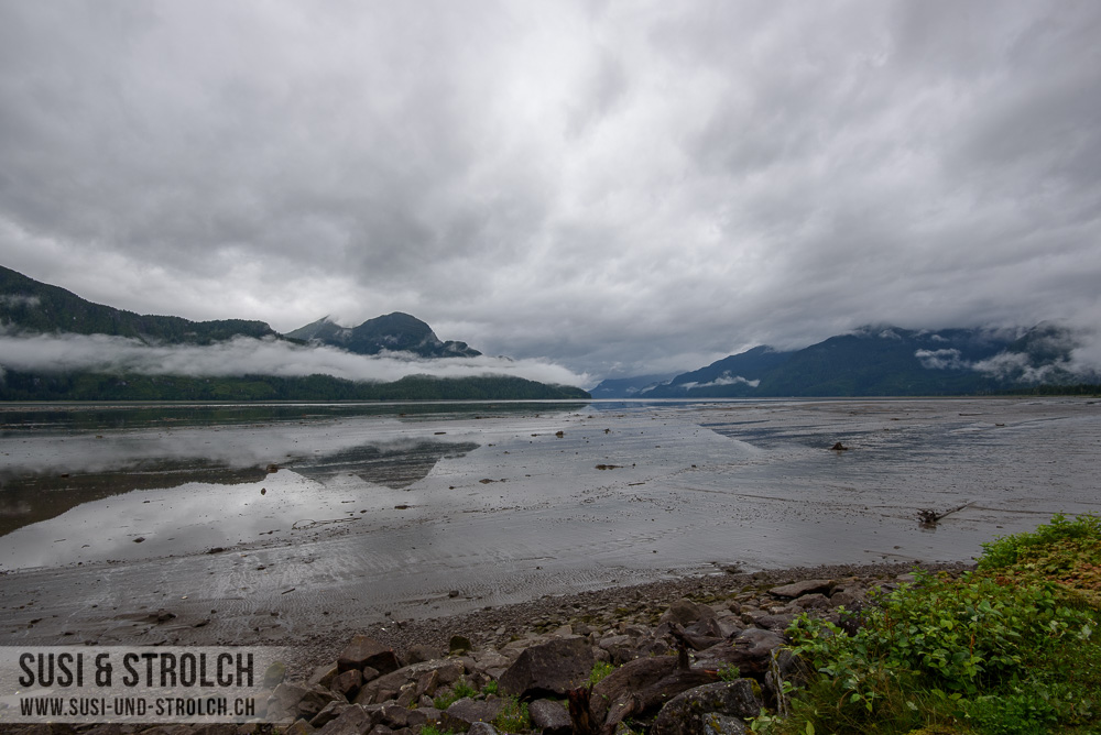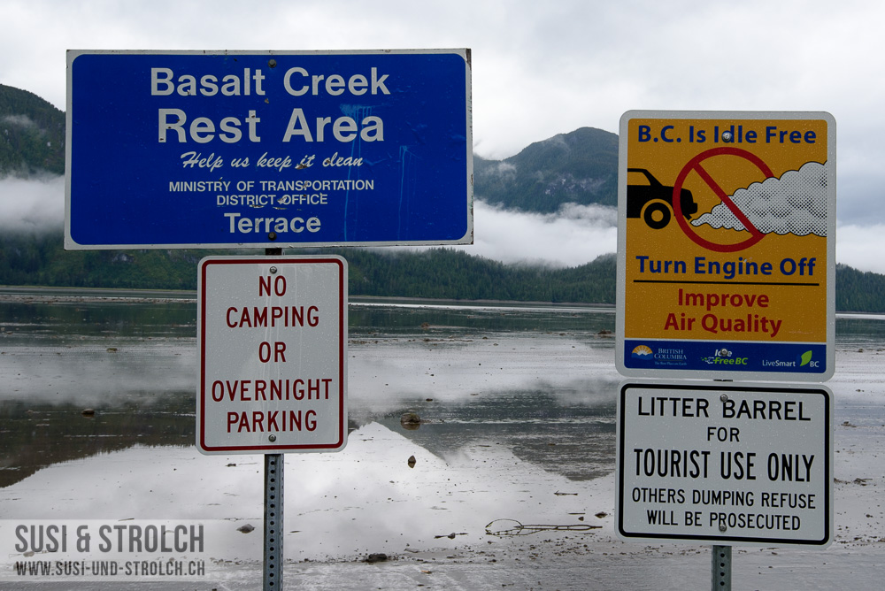 Das Wetter war leider nach wie vor nicht viel besser, aber heute war das nicht weiter tragisch, hatten wir doch einen Fahrtag von uns. Die 350km von Prince Rupert nach Smithers bedeuteten vier Stunden reine Fahrzeit. Wir nahmen es aber recht gemütlich, beim „Exchamsiks River Provincial Park“ machten wir einen ersten Halt, dort gabs neben einem eindrücklichen Wald mit Bärenkacke und ekligen Riesenschnecken aber nicht so wirklich was zu sehen.