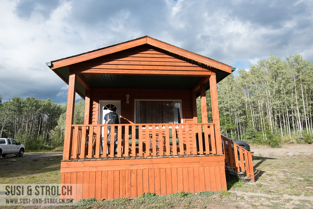 Kurz vor Smithers erreichten wir gegen 16:30 Uhr unsere nächste Unterkunft: Eigentlich ein Campingplatz, aber da gibt’s auch einige Blockhütten. Eigentlich hatten wir eine kleine gebucht, aber aus irgendwelchen Gründen mussten wir umquartiert werden. Nun hausen wir diese Nacht also in einer grossen Blockhütte mit Platz für 6 Personen und Küche und allem drum und dran *lach* 😀 Und das für 75 CAND, was ca. 50 sFr. entspricht… Fürs Abendessen holten wir uns Fleisch, Salat und Kartoffeln und kochten gemütlich unser eigenes Abendessen.